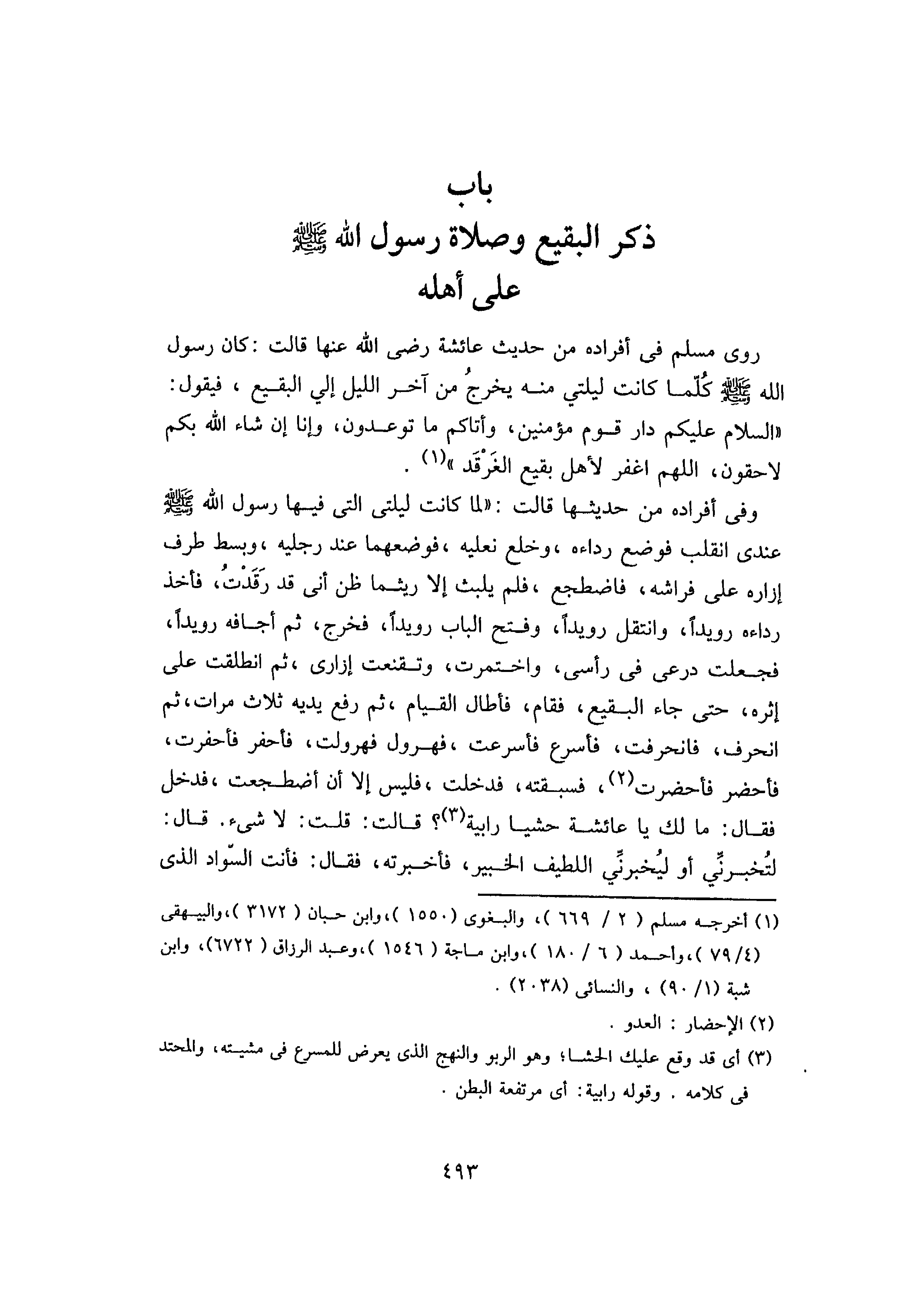 رَوَى مُسْلِمٌ فِي أَفْرَادِهِ، مِنْ حَدِيثِ عَائِشَةَ رَضِيَ اللَّهُ عَنْهَا، قَالَتْ: كَانَ رَسُولُ اللَّهِ صَلَّى اللَّهُ عَلَيْهِ وَسَلَّمَ كُلَّمَا كَانَتْ لَيْلَتِي مِنْهُ يَخْرُجُ آخِرَ اللَّيْلِ إِلَى الْبَقِيعِ، فَيَقُولُ: «السَّلامُ عَلَيْكُمْ دَارَ قَوْمٍ مُؤْمِنِينَ، وَأَتَاكُمْ مَا تُوعَدُونَ، وَإِنَّا إِنْ شَاءَ اللَّهُ بِكُمْ لاحِقُونَ، اللَّهُمَّ اغْفِرْ لأَهْلِ بَقِيعِ الْغَرْقَدِ» .