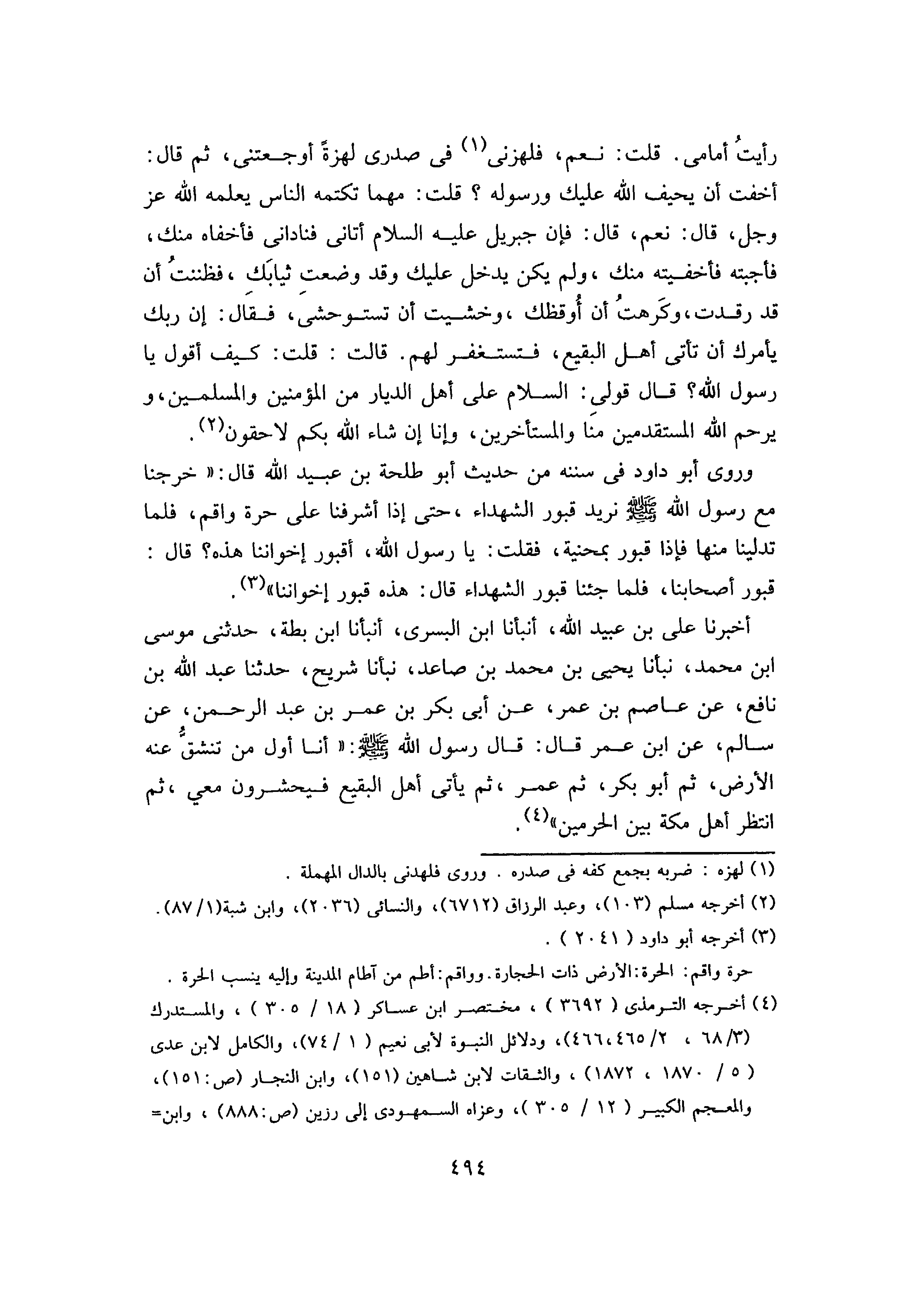 وَرَوَى أَبُو دَاوُدَ فِي سُنَنِهِ، مِنْ حَدِيثِ أَبِي طَلْحَةَ بْنِ عُبَيْدِ اللَّهِ، قَالَ: " خَرَجْنَا مَعَ رَسُولِ اللَّهِ صَلَّى اللَّهُ عَلَيْهِ وَسَلَّمَ نُرِيدُ قُبُورَ الشُّهَدَاءِ، حَتَّى إِذَا أَشْرَفْنَا عَلَى حَرَّةِ وَاقِمٍ، فَلَمَّا تَدَلَّيْنَا مِنْهَا فَإِذَا قُبُورٌ بِمَحْنِيَةٍ، فَقُلْتُ: يَا رَسُولَ اللَّهِ، أَقُبُورُ إِخْوَانِنَا هَذِهِ؟ قَالَ: " قُبُورُ أَصْحَابِنَا، فَلَمَّا جِئْنَا قُبُورَ الشُّهَدَاءِ، قَالَ: هَذِهِ قُبُورُ إِخْوَانِنَا ".