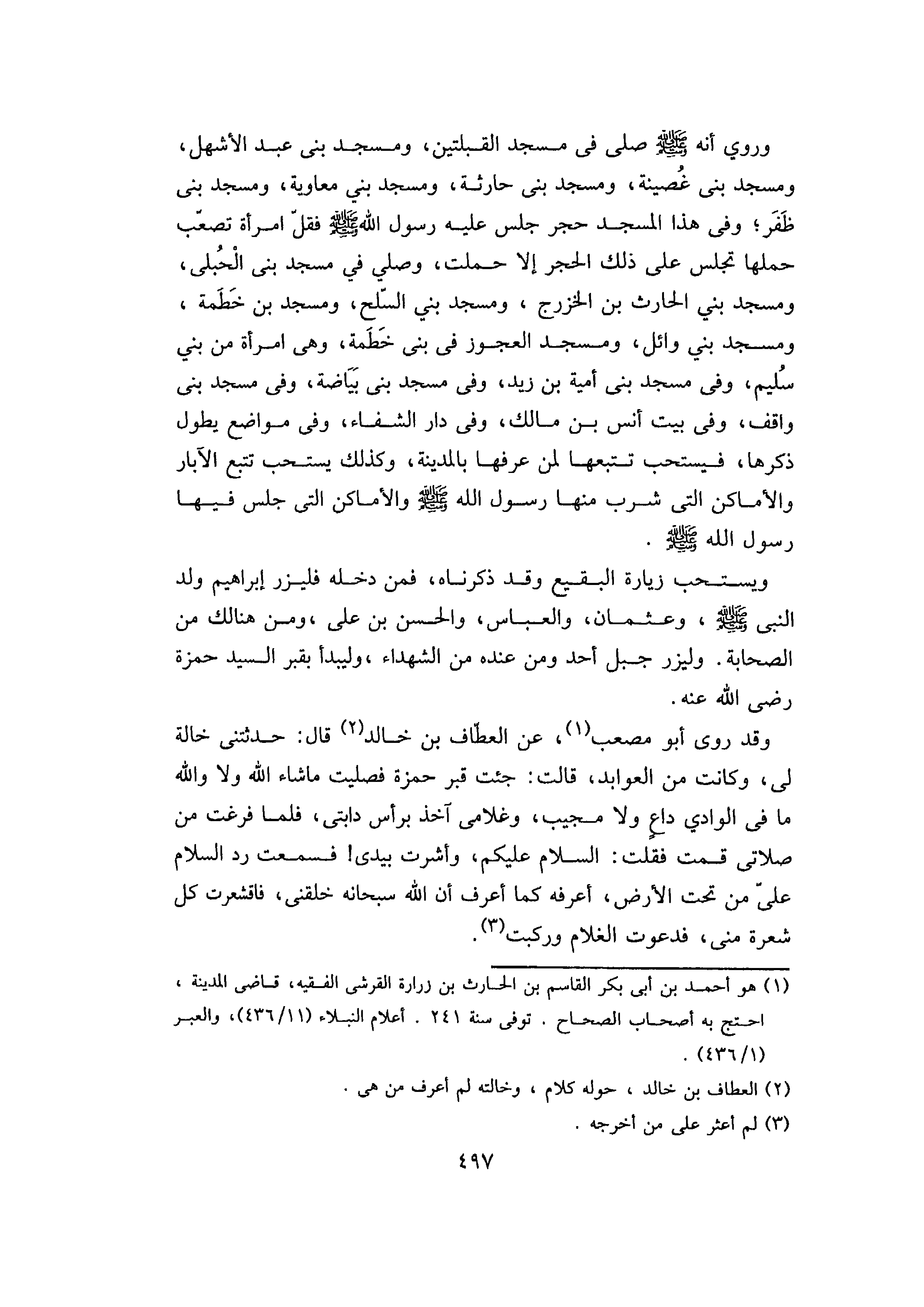 وَقَدْ رَوَى أَبُو مُصْعَبٍ، عَنِ الْعَطَّافِ بْنِ خَالِدٍ، قَالَ: حَدَّثَتْنِي خَالَةٌ لِي، وَكَانَتْ مِنَ الْعَوَابِدِ، قَالَتْ: جِئْتُ قَبْرَ حَمْزَةَ فَصَلَّيْتُ مَا شَاءَ اللَّهُ وَلا وَاللَّهِ مَا فِي الْوَادِي دَاعٍ وَلا مُجِيبٌ، وَغُلامِي آخِذٌ بِرَأْسِ دَابَّتِي، فَلَمَّا فَرَغْتُ مَنْ صَلاتِي قُمْتُ فَقُلْتُ: السَّلامُ عَلَيْكُمْ، وَأَشَرْتُ بِيَدِي، فَسَمِعْتُ رَدَّ السَّلامِ عَلَيَّ مِنْ تَحْتِ الأَرْضِ، أَعْرِفُهُ كَمَا أَعْرِفُ أَنَّ اللَّهَ سُبْحَانَهُ خَلَقَنِي، فَاقْشَعَرَّتْ كُلُّ شَعْرَةٍ مِنِّي، فَدَعَوْتُ الْغُلامَ وَرَكِبْتُ.