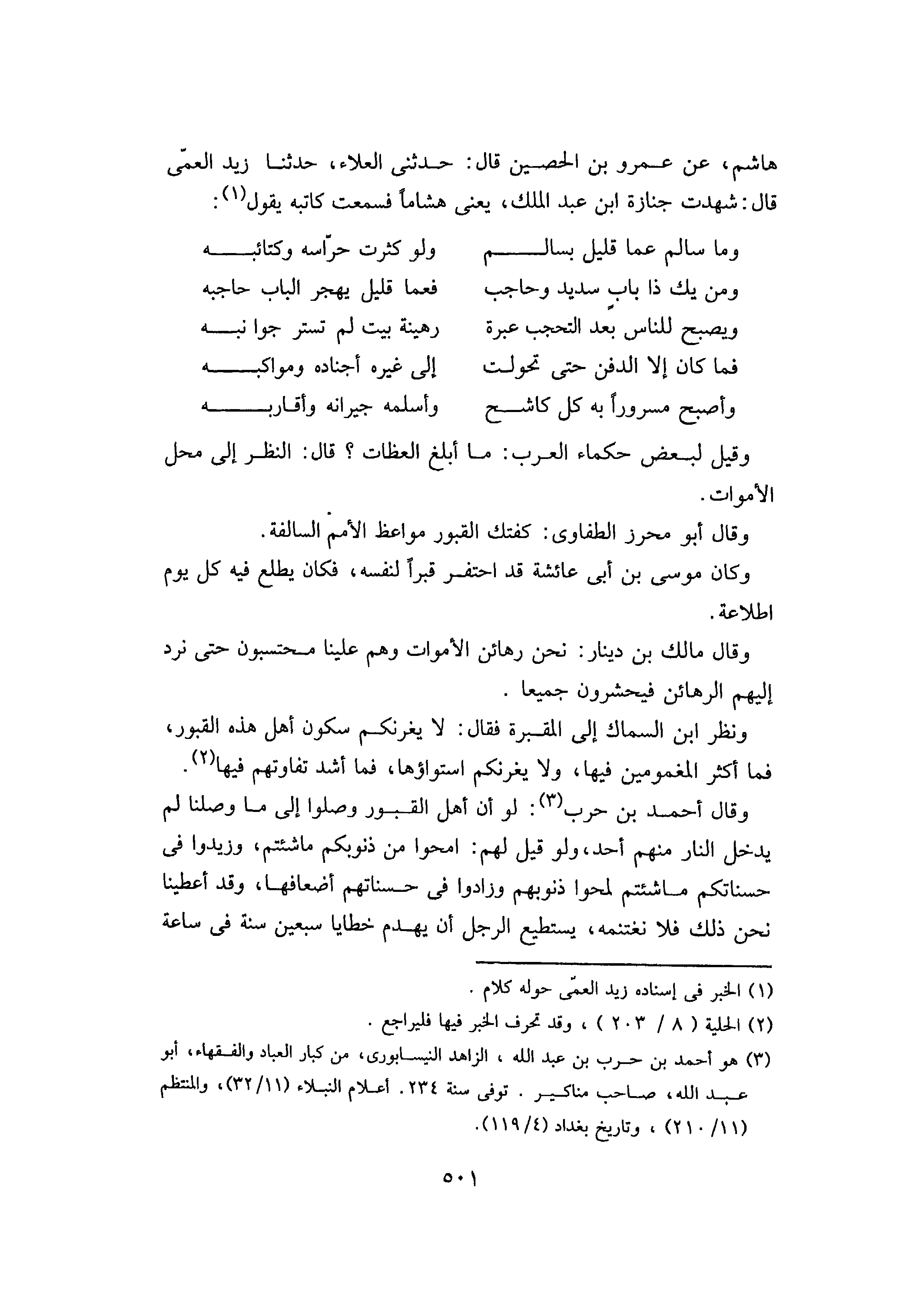 هَاشِمٍ، عَنْ عَمْرِو بْنِ الْحُصَيْنِ، قَالَ: حَدَّثَنِي الْعَلاءُ، حَدَّثَنَا زَيْدٌ الْعَمِّيُّ، قَالَ: شَهِدْتُ جِنَازَةَ ابْنِ عَبْدِ الْمَلِكِ، يَعْنِي هِشَامًا، فَسَمِعْتُ كَاتِبَهُ يَقُولُ: