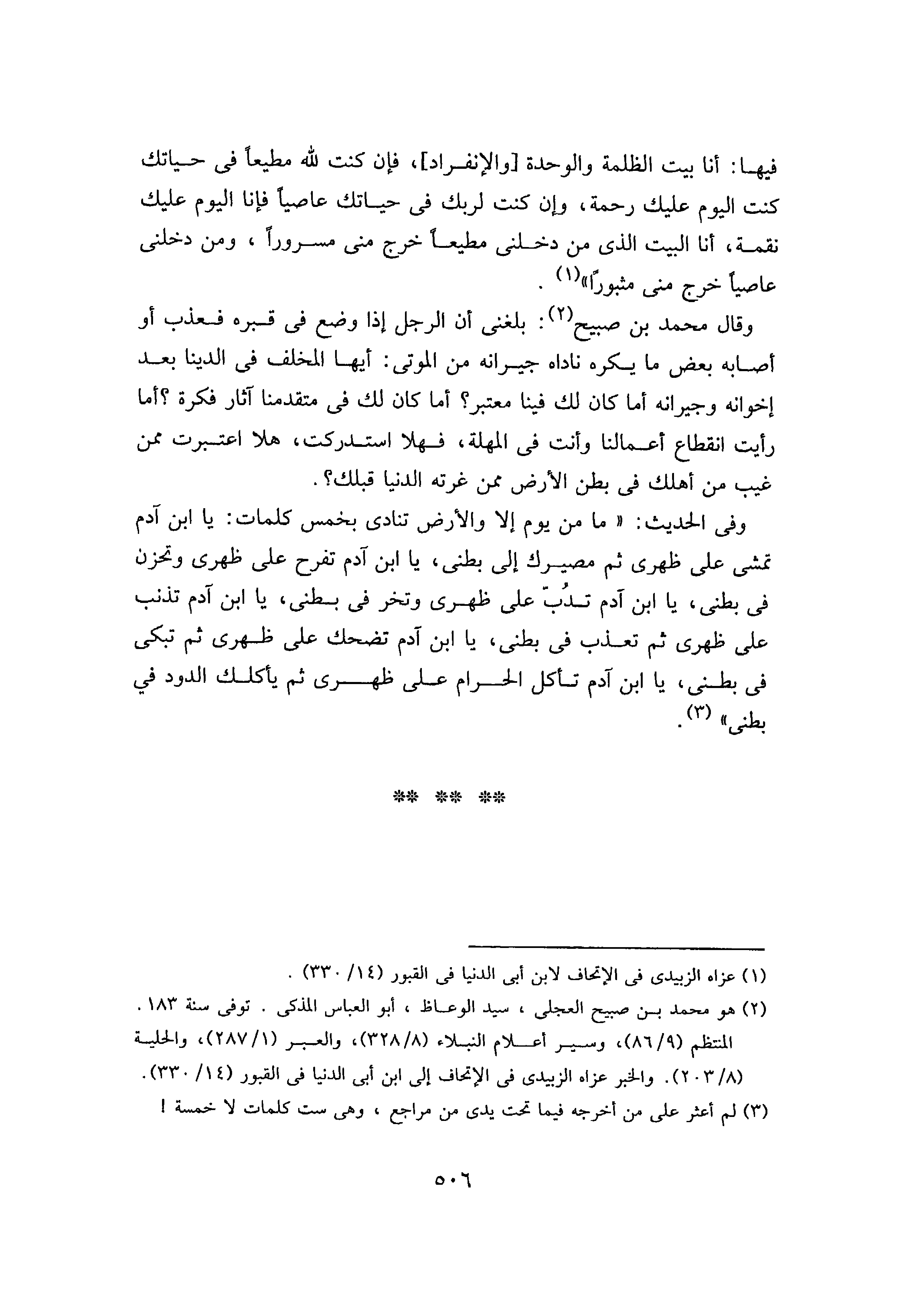 وَقَالَ مُحَمَّدُ بْنُ صُبَيْحٍ: بَلَغَنِي أَنَّ الرَّجُلَ إِذَا وُضِعَ فِي قَبْرِهِ فَعُذِّبَ أَوْ أَصَابَهُ بَعْضُ مَا يَكْرَهُ نَادَاهُ جِيرَانُهُ مِنَ الْمَوْتَى: أَيُّهَا الْمُخْلَفُ فِي الدُّنْيَا بَعْدَ إِخْوَانِهِ وَجِيرَانِهِ أَمَا كَانَ لَكَ فِينَا مُعْتَبَرٌ؟ أَمَا كَانَ لَكَ فِي مُتَقَدِّمِنَا آثَارُ فِكْرَةٍ؟ أَمَا رَأَيْتَ انْقِطَاعَ أَعْمَالِنَا وَأَنْتَ فِي الْمُهْلَةِ، فَهَلا اسْتَدْرَكْتَ، هَلا اعْتَبَرْتَ مِمَّنْ غُيِّبَ مِنْ أَهْلِكَ فِي بَطْنِ الأَرْضِ مِمَّنْ غَرَّتْهُ الدُّنْيَا قَبْلَكَ؟ وَفِي الْحَدِيثِ: " مَا مِنْ يَوْمٍ إِلا وَالأَرْضُ تُنَادِي بِخَمْسِ كَلِمَاتٍ: يَا ابْنَ آدَمَ، تَمْشِي عَلَى ظَهْرِي ثُمَّ مَصِيرُكَ إِلَى بَطْنِي، يَا ابْنَ آدَمَ، تَفْرَحُ عَلَى ظَهْرِي وَتَحْزَنُ فِي بَطْنِي، يَا ابْنَ آدَمَ، تَدُبُّ عَلَى ظَهْرِي وَتَخِرُّ فِي بَطْنِي، يَا ابْنَ آدَمَ، تُذْنِبُ عَلَى ظَهْرِي، ثُمَّ تُعَذَّبُ فِي بَطْنِي، يَا ابْنَ آدَمَ، تَضْحَكُ عَلَى ظَهْرِي ثُمَّ تَبِكي فَي بَطْنِي، يَا ابْنَ آدَمَ، تَأْكُلُ الْحَرَامَ عَلَى ظَهْرِي، ثُمَّ يَأْكُلُكَ الدُّودُ فِي بَطْنِي ".
