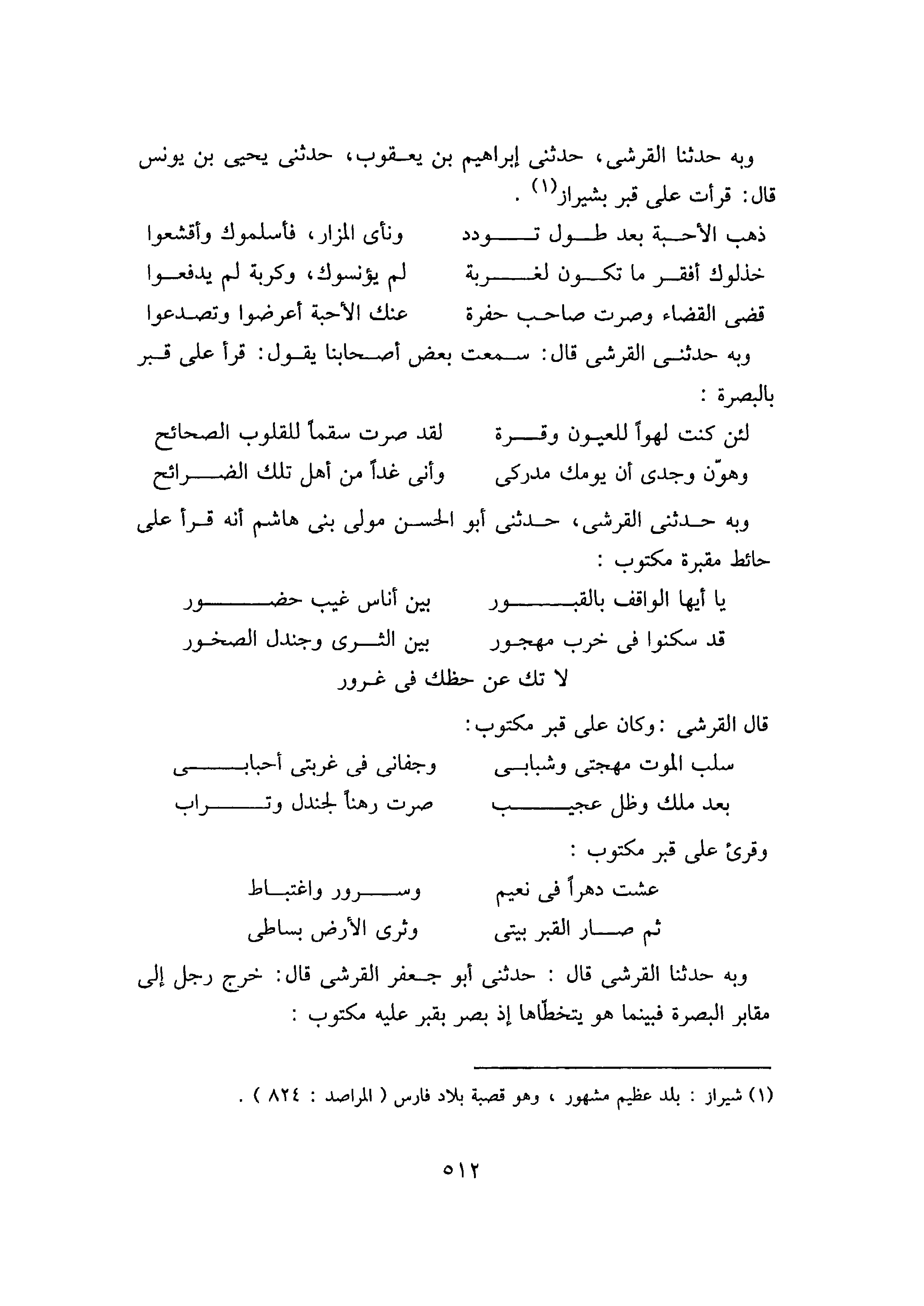 وَبِهِ حَدَّثَنَا الْقُرَشِيُّ، قَالَ: حَدَّثَنِي أَبُو جَعْفَرٍ الْقُرَشِيُّ، قَالَ: خَرَجَ رَجُلٌ إِلَى مَقَابِرِ الْبَصْرَةِ فَبَيْنَمَا هُوَ يَتَخَطَّاهَا إِذْ بَصُرَ بِقَبْرٍ عَلَيْهِ مَكْتُوبٌ: