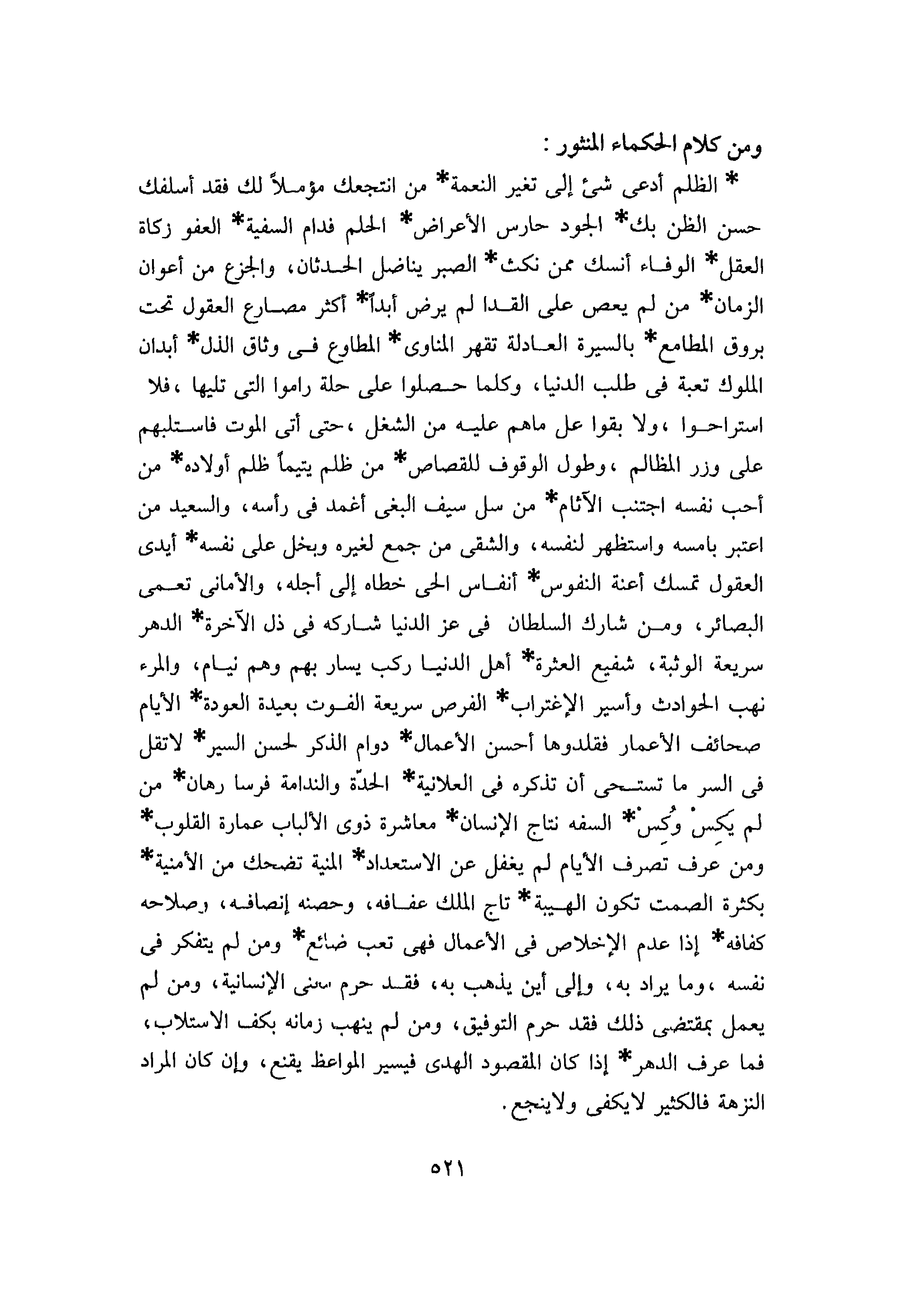 وَمِنْ كَلامِ الْحُكَمَاءِ الْمَنْثُورِ: الظُّلْمُ أَدْعَى شَيْءٍ إِلَى تَغَيُّرِ النِّعْمَةِ.