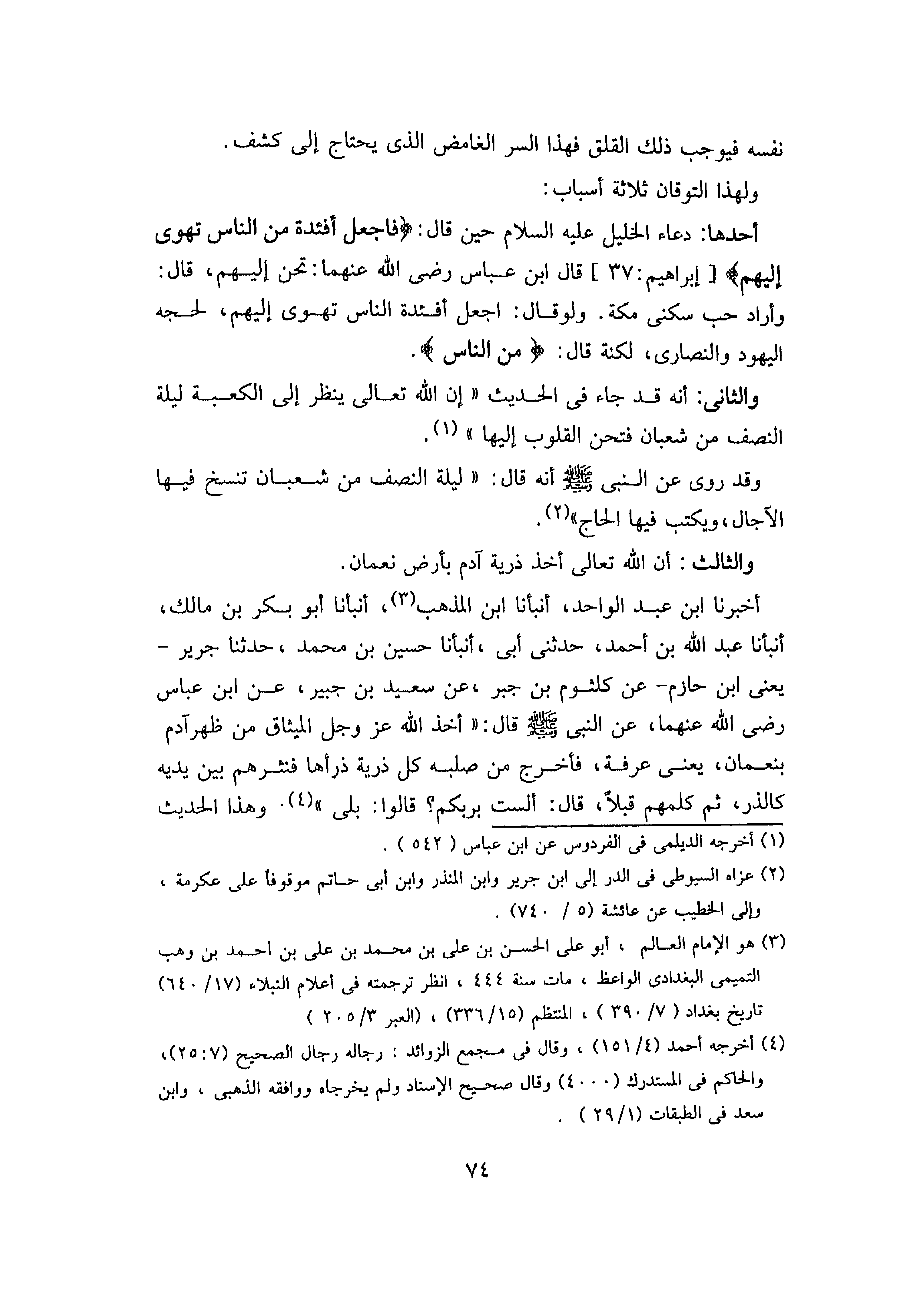 وَلِهَذَا التَّوَقَانِ ثَلاثَةُ أَسْبَابٍ: أَحَدُهَا: دُعَاءُ الْخَلِيلِ إِبْرَاهِيمَ عَلَيْهِ السَّلامُ، حِينَ قَالَ: {فَاجْعَلْ أَفْئِدَةً مِنَ النَّاسِ تَهْوِي إِلَيْهِمْ} [إبراهيم: 37] ، قَالَ ابْنُ عَبَّاسٍ رَضِيَ اللَّهُ عَنْهُمَا: تَحِنُّ إِلَيْهِمْ، قَالَ: وَأَرَادَ حُبَّ سُكْنَى مَكَّةَ، وَلَوْ قَالَ: اجْعَلْ أَفْئِدَةَ النَّاسِ تَهْوِي إِلَيْهِمْ؛ لَحَجَّهُ الْيَهُودُ وَالنَّصَارَى، لَكِنَّهُ قَالَ: {مِنَ النَّاسِ} [إبراهيم: 37] .