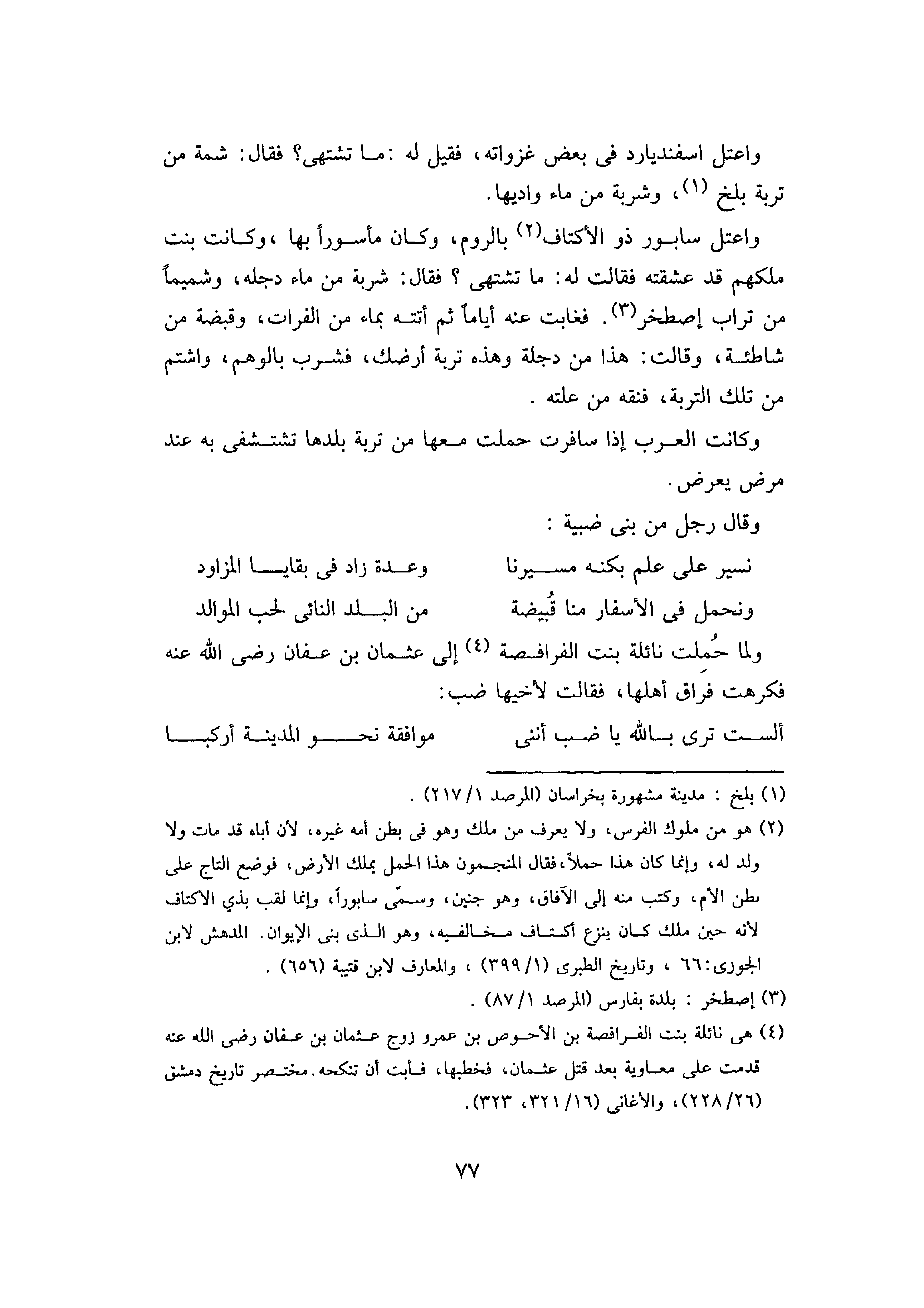 ولَمَّا حُمِلَتْ نَائِلَةُ بِنْتُ الْفَرَافِصَةِ إِلَى عُثْمَانَ بْنِ عَفَّانَ رَضِيَ اللَّهُ عَنْهُ فَكَرِهَتْ فِرَاقَ أَهْلِهَا، فَقَالَتْ لِأَخِيهَا ضَبٍّ: