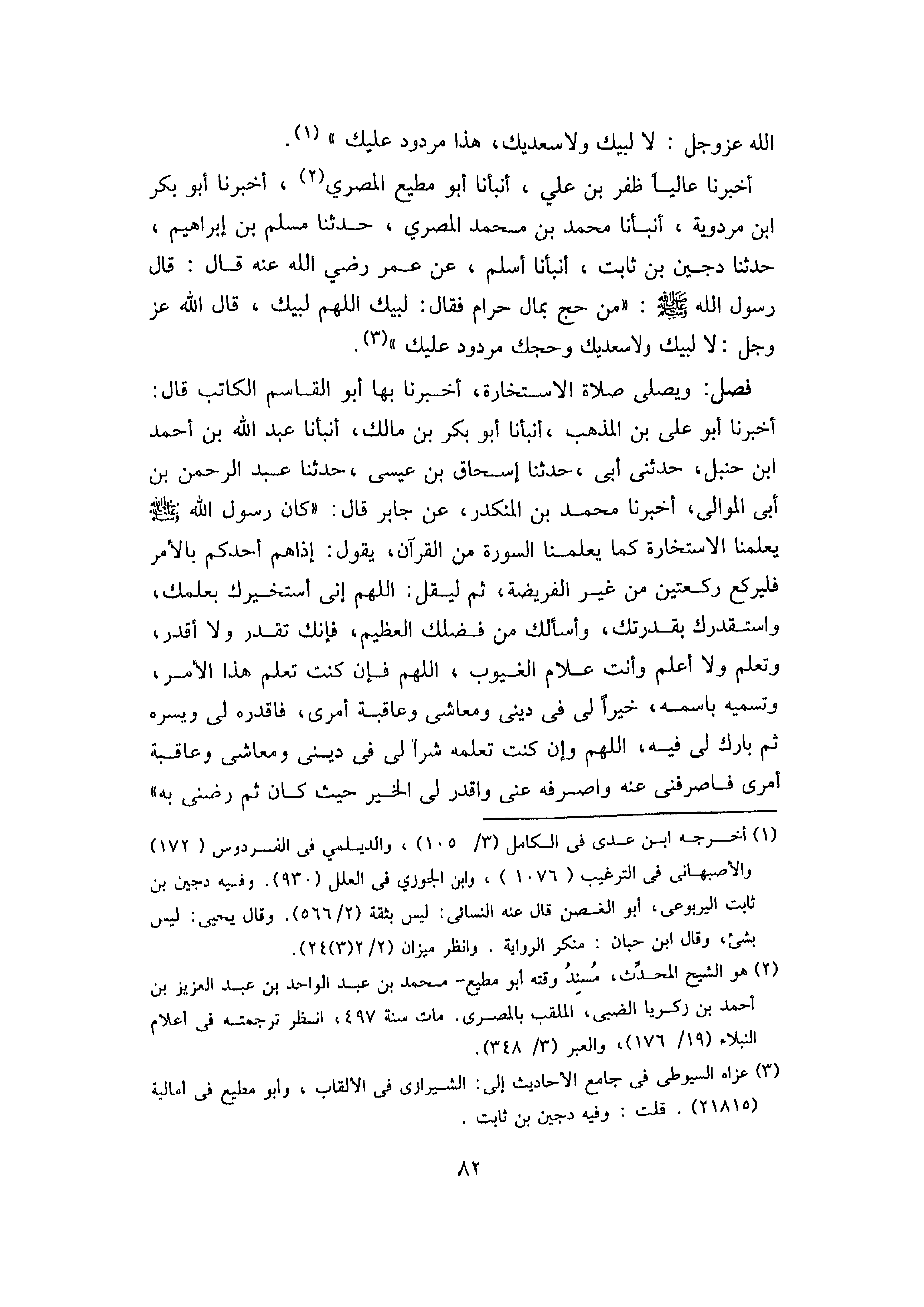 أَخْبَرَنَا بِهَا أَبُو الْقَاسِمِ الْكَاتِبُ، قَالَ: أَخْبَرَنَا أَبُو عَلِيِّ بْنُ الْمُذْهِبِ، أَنْبَأَنَا أَبُو بَكْرِ بْنُ مَالِكٍ، أَنْبَأَنَا عَبْدُ اللَّهِ بْنُ أَحْمَدَ بْنِ حَنْبَلٍ، حَدَّثَنِي أَبِي، حَدَّثَنَا إِسْحَاقُ بْنُ عِيسَى، حَدَّثَنَا عَبْدُ الرَّحْمَنِ بْنُ أَبِي الْمَوَالِي، أَخْبَرَنَا مُحَمَّدُ بْنُ الْمُنْكَدِرِ، عَنْ جَابِرٍ، قَالَ: كَانَ رَسُولُ اللَّهِ صَلَّى اللَّهُ عَلَيْهِ وَسَلَّمَ يُعَلِّمُنَا الاسْتِخَارَةَ كَمَا يُعَلِّمُنَا السُّورَةَ مِنَ الْقُرْآنِ، يَقُولُ: " إِذَا هَمَّ أَحَدُكُمْ بِالْأَمْرِ فَلْيَرْكَعْ رَكْعَتَيْنِ مِنْ غَيْرِ الْفَرِيضَةِ، ثُمَّ لْيَقُلْ: اللَّهُمَّ إِنِّي أَسْتَخْيرُكَ بِعِلْمِكَ، وَأَسْتَقْدِرُكَ بِقُدْرَتِكَ، وَأَسْأَلُكَ مِنْ فَضْلِكَ الْعَظِيمِ، فَإِنَّكَ تَقْدِرُ وَلا أَقْدِرُ، وَتَعْلَمُ وَلا أَعْلَمُ، وَأنْتَ عَلامُ الْغُيُوبِ، اللَّهُمَّ فَإِنْ كُنْتَ تَعْلَمُ هَذَا الْأَمْرَ، وَتُسَمِّيهِ بِاسْمِهِ، خَيْرًا لِي فِي دِينِي وَمَعَاشِي وَعَاقِبَةِ أَمْرِي، فَاقْدُرْهُ لِي وَيَسِّرْهُ ثُمَّ بَارِكَ لِي فِيهِ، اللَّهُمَّ وَإِنْ كُنْتَ تَعْلَمُهُ شَرًّا لِي فِي دِينِي وَمَعَاشِي وَعَاقِبَةِ أَمْرِي فَاصْرِفْنِي عَنْهُ وَاصْرِفْهُ عَنِّي، وَاقْدُرْ لِيَ الْخَيْرَ حَيْثُ كَانَ ثُمَّ رَضِّنِي بِهِ ".