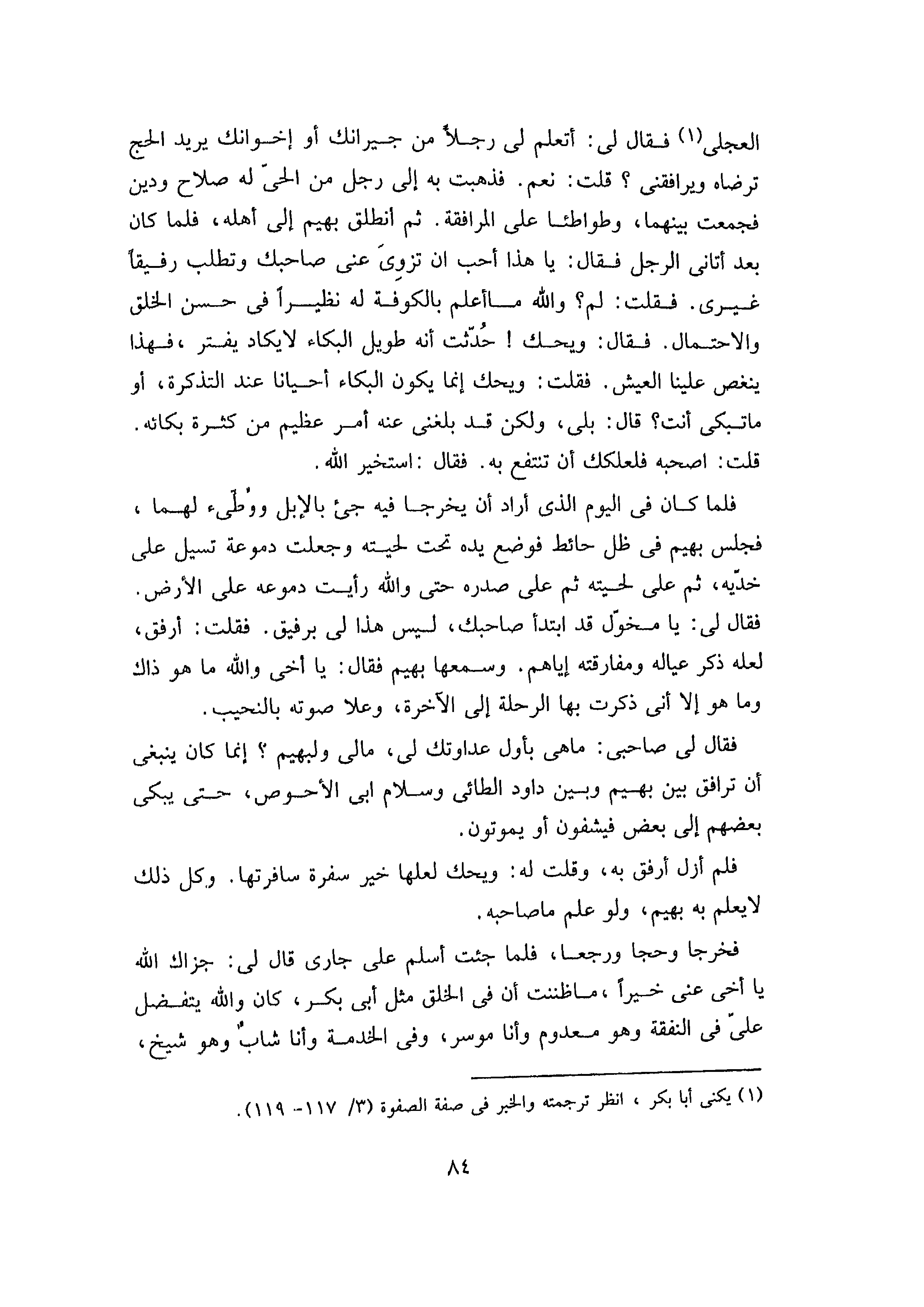 فَلَمْ أَزَلْ أَرْفُقُ بِهِ، وَقُلْتُ لَهُ: وَيْحَكَ! لَعَلَّهَا خَيْرُ سَفْرَةٍ سَافَرْتَهَا، وَكُلُّ ذَلِكَ لا يَعْلَمُ بِهِ بَهِيمٌ، وَلَوْ عَلِمَ مَا صَاحَبَهُ.