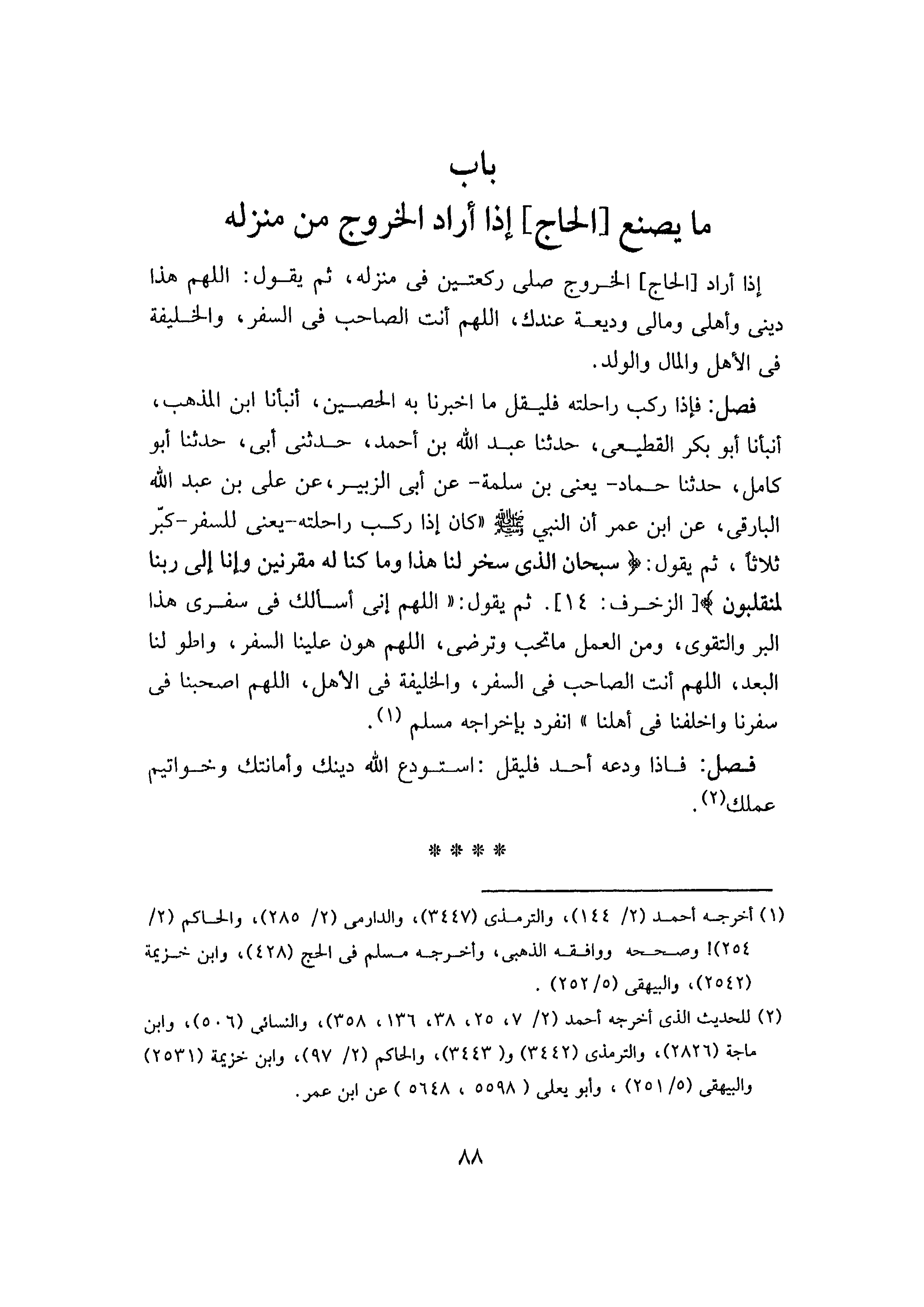 إِذَا أَرَادَ الْحَاجُّ الْخُرُوجَ صَلَّى رَكْعَتَيْنِ فِي مَنْزِلِهِ، ثُمَّ يَقُولُ: اللَّهُمَّ هَذَا دِينِي وَأَهْلِي، وَمَالِي وَدِيعَةٌ عِنْدَكَ، اللَّهُمَّ أَنْتَ الصَّاحِبُ فِي السَّفَرِ، وَالْخَلِيفَةُ فِي الْأَهْلِ، وَالْمَالِ، وَالْوَلَدِ.