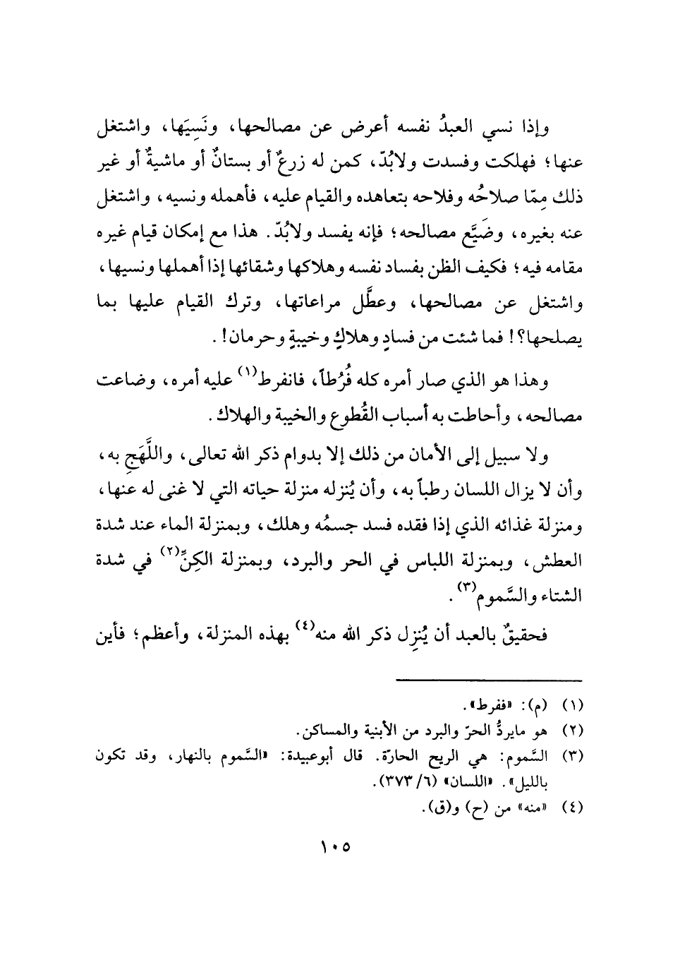 وإذا نسي العبدُ نفسه أعرض عن مصالحها، ونَسِيَها، واشتغل عنها؛ فهلكت وفسدت ولابُدّ، كمن له زرعٌ أو بستانٌ أو ماشيةٌ أو غير ذلك مِمّا صلاحُه وفلاحه بتعاهده والقيام عليه، فأهمله ونسيه، واشتغل عنه بغيره، وضَيَّع مصالحه؛ فإنه يفسد ولابُدّ. هذا مع إمكان قيام غيره مقامه فيه؛ فكيف الظن بفساد نفسه وهلاكها وشقائها إذا أهملها ونسيها، واشتغل عن مصالحها، وعطَّل مراعاتها، وترك القيام عليها بما يصلحها؟! فما شئت من فسادٍ وهلاكٍ وخيبةٍ وحرمان!.