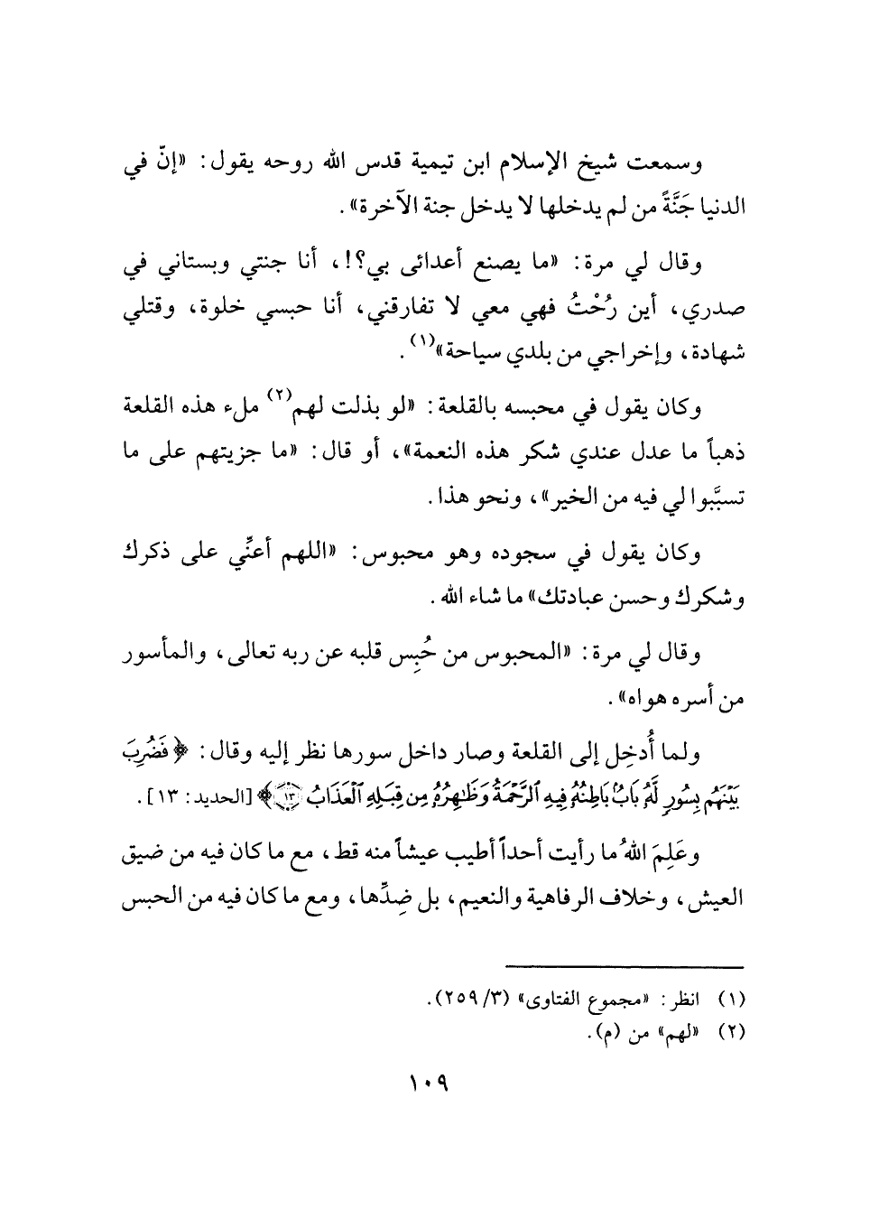 وسمعت شيخ الإسلام ابن تيمية قدس الله روحه يقول: "إنّ في الدنيا جَنَّةً من لم يدخلها لا يدخل جنة الآخرة".