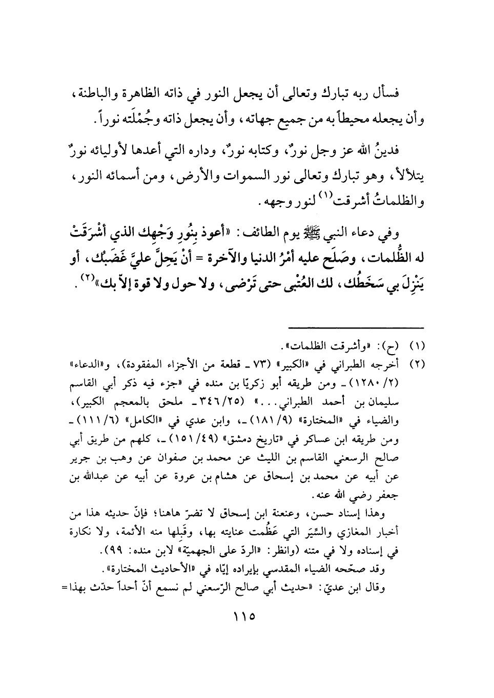 وفي دعاء النبي -صَلَّى اللهُ عَلَيْهِ وَسَلَّمَ- يوم الطائف: "أعوذ بِنُورِ وَجْهِك الذي أشْرَقَتْ له الظُّلمات، وصَلَح عليه أمْرُ الدنيا والآخرة = أنْ يَحِلَّ عليَّ غَضَبُك، أو يَنْزِلَ بي سَخَطُك، لك العُتْبى حتى تَرْضى، ولا حول ولا قوة إلّا بك" (¬٢) .