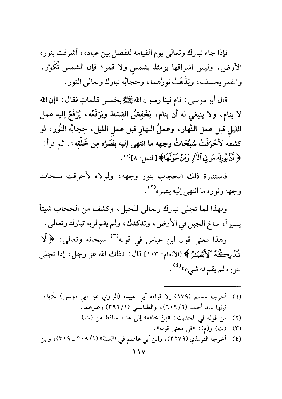 وهذا معنى قول ابن عباس في قوله (¬٣) سبحانه وتعالى: {لَا تُدْرِكُهُ الْأَبْصَارُ} [الأنعام: ١٠٣] قال: "ذلك الله عز وجل، إذا تجلى بنوره لم يقم له شيء" (¬٤).