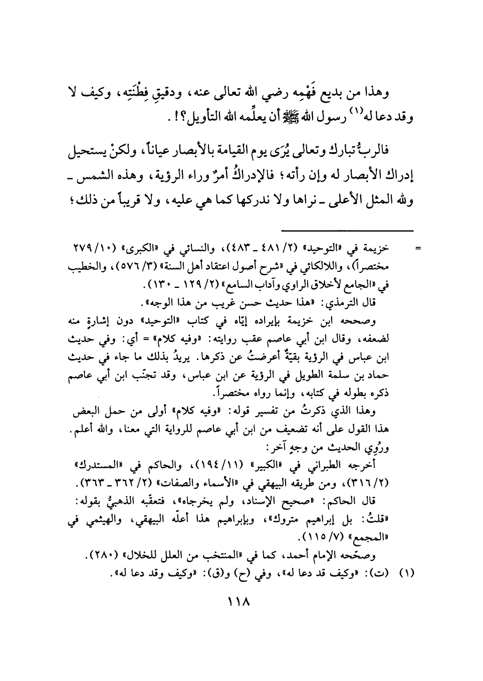 وصححه ابن خزيمة بإيراده إيّاه في كتاب "التوحيد" دون إشارةٍ منه لضعفه، وقال ابن أبي عاصم عقب روايته: "وفيه كلام" = أي: وفي حديث ابن عباس في الرؤية بقيّةٌ أعرضتُ عن ذكرها. يريدُ بذلك ما جاء في حديث حماد بن سلمة الطويل في الرؤية عن ابن عباس، وقد تجنّب ابن أبي عاصم ذكره بطوله في كتابه، وإنما رواه مختصرًا.
