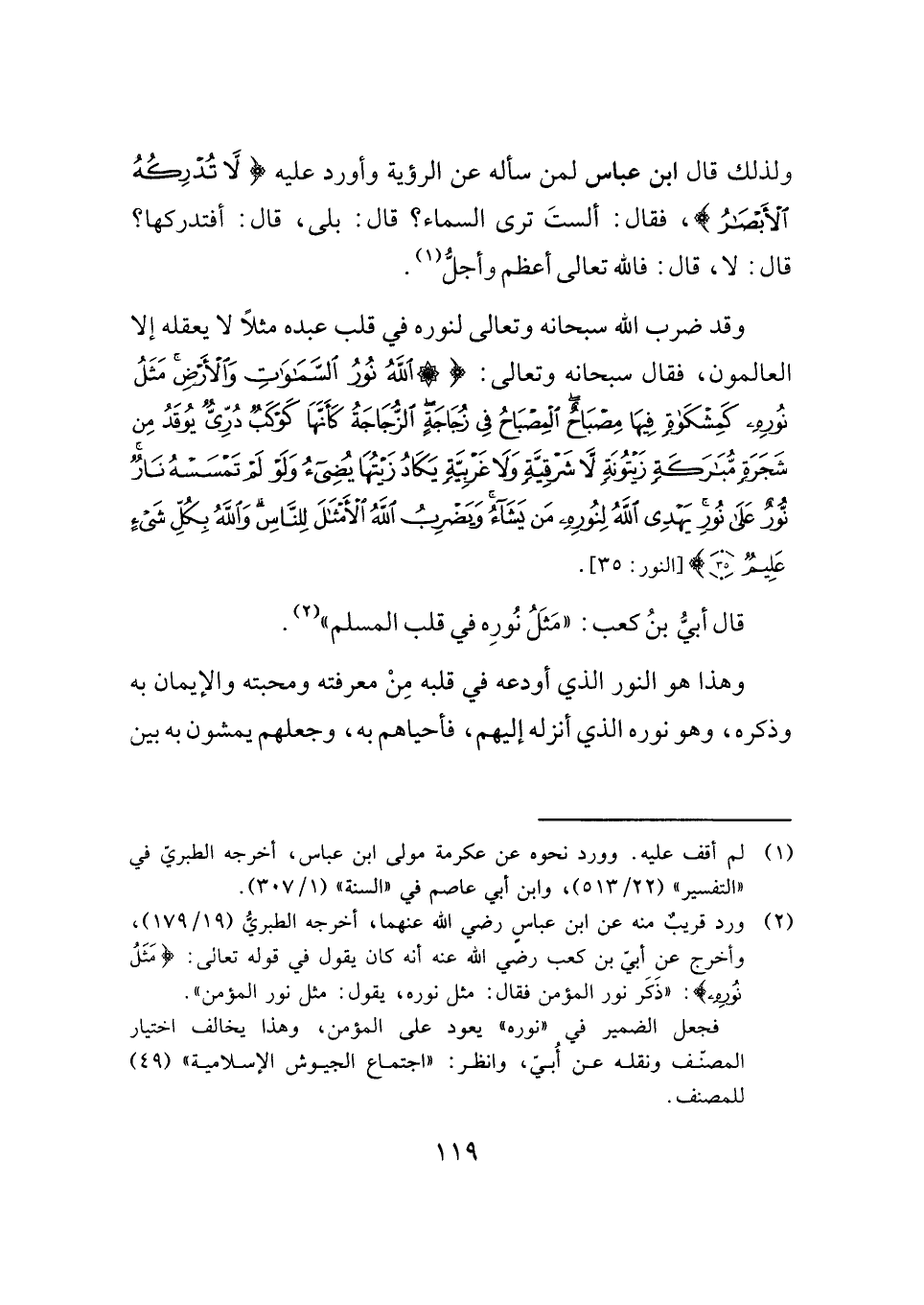 (¬٢) ورد قريبٌ منه عن ابن عباسٍ رضي الله عنهما، أخرجه الطبريُّ (١٩/ ١٧٩)، وأخرج عن أبيّ بن كعب رضي الله عنه أنه كان يقول في قوله تعالى: {مَثَلُ نُورِهِ}: "ذَكَر نور المؤمن فقال: مثل نوره، يقول: مثل نور المؤمن".