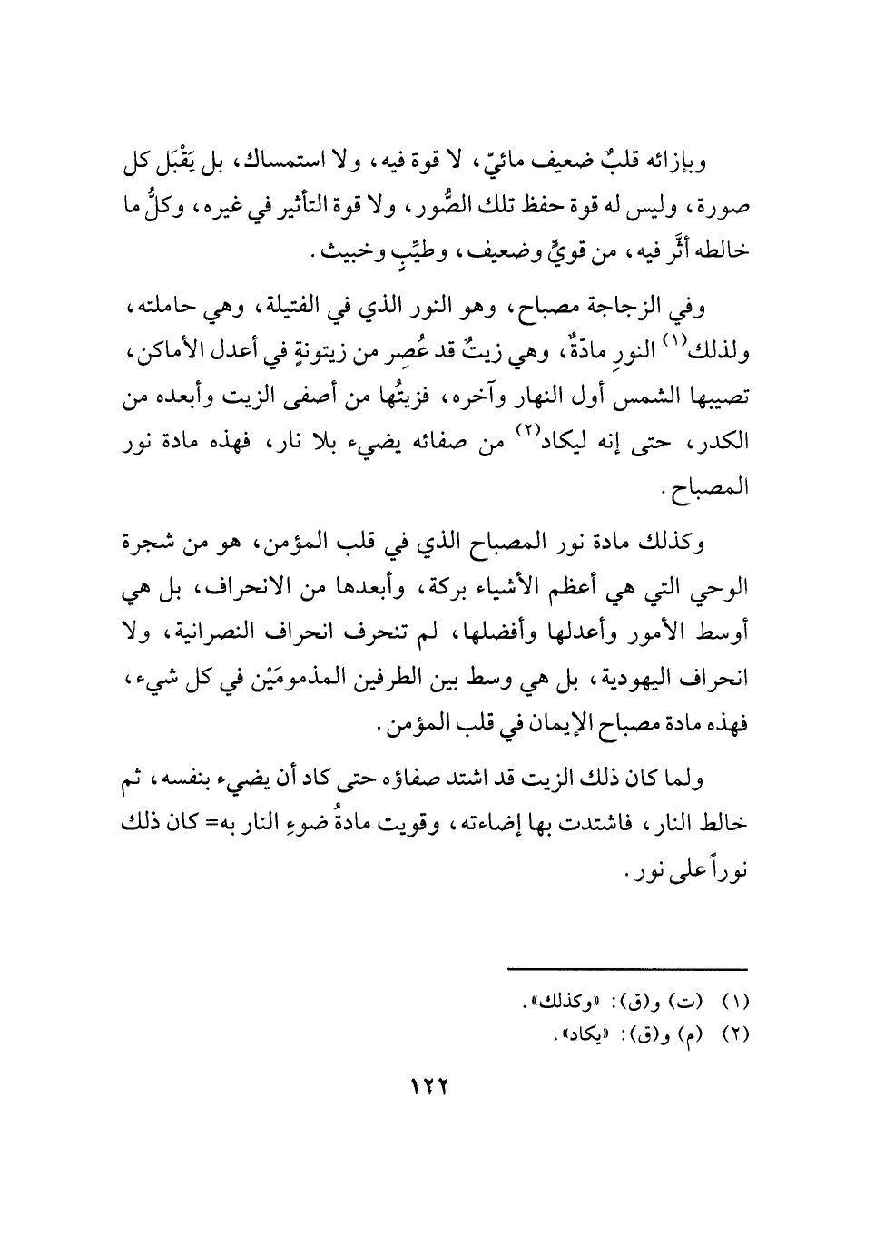 وفي الزجاجة مصباح، وهو النور الذي في الفتيلة، وهي حاملته، ولذلك (¬١) النورِ مادّةٌ، وهي زيتٌ قد عُصِر من زيتونةٍ في أعدل الأماكن، تصيبها الشمس أول النهار وآخره، فزيتُها من أصفى الزيت وأبعده من الكدر، حتى إنه ليكاد (¬٢) من صفائه يضيء بلا نار، فهذه مادة نور المصباح.