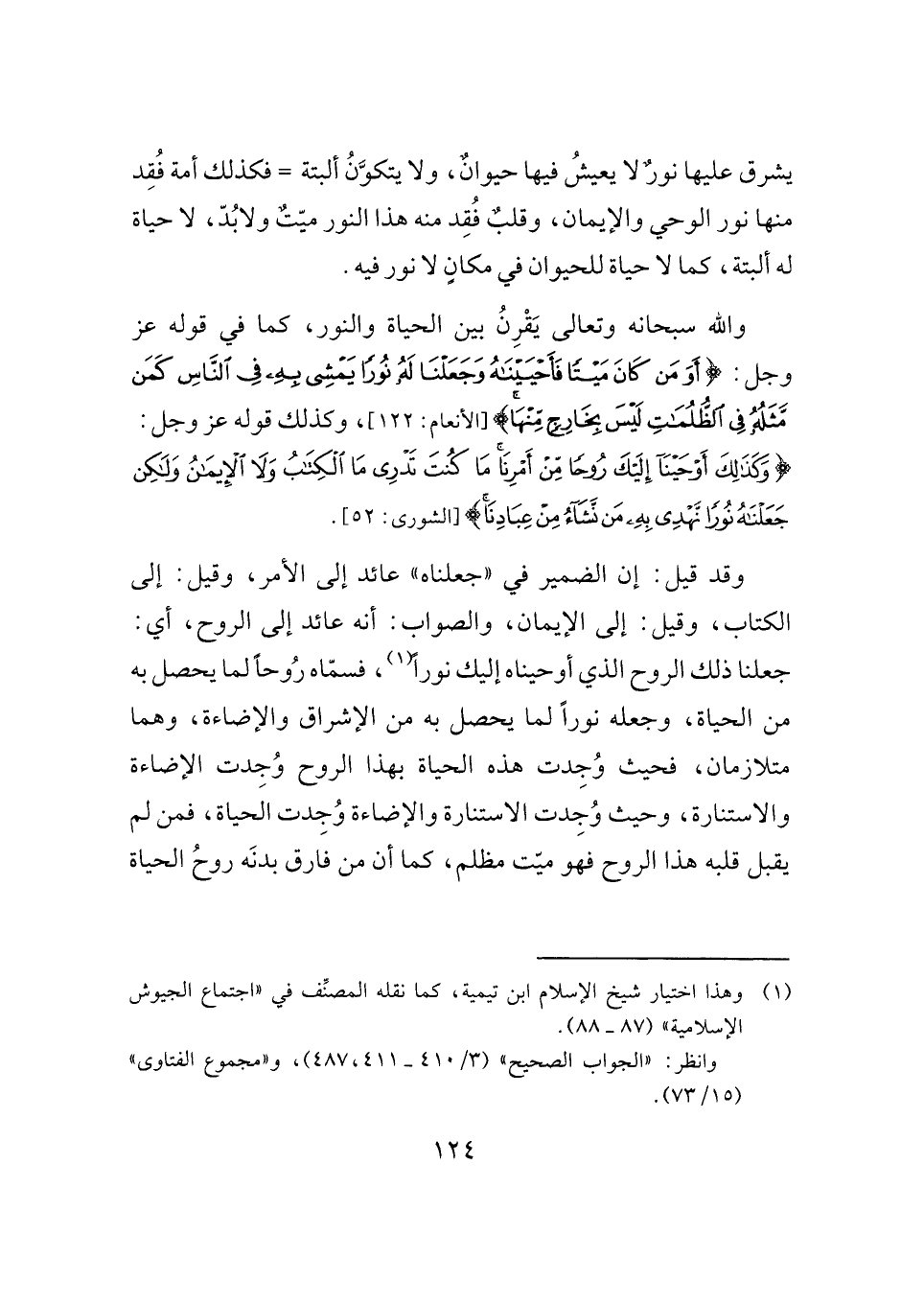 وقد قيل: إن الضمير في "جعلناه" عائد إلى الأمر، وقيل: إلى الكتاب، وقيل: إلى الإيمان، والصواب: أنه عائد إلى الروح، أي: جعلنا ذلك الروح الذي أوحيناه إليك نورًا (¬١) ، فسمّاه رُوحًا لما يحصل به من الحياة، وجعله نورًا لما يحصل به من الإشراق والإضاءة، وهما متلازمان، فحيث وُجِدت هذه الحياة بهذا الروح وُجِدت الإضاءة والاستنارة، وحيث وُجِدت الاستنارة والإضاءة وُجِدت الحياة، فمن لم يقبل قلبه هذا الروح فهو ميّت مظلم، كما أن من فارق بدنَه روحُ الحياة