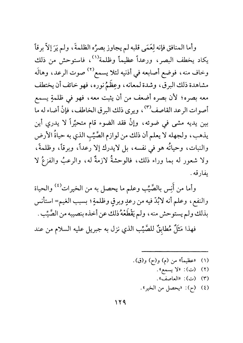 وأما المنافق فإنه لِعَمَى قلبه لم يجاوز بصرُه الظلمةَ، ولم يَرَ إلّا برقًا يكاد يخطف البصر، ورعدًا عظيمًا وظلمة (¬١) ، فاستوحش من ذلك وخاف منه، فوضع أصابعه في أذنيه لئلا يسمع (¬٢) صوت الرعد، وهالَه مشاهدة ذلك البرق، وشدة لمعانه، وعِظَمُ نوره، فهو خائف أن يختطف معه بصره؛ لأن بصره أضعف من أن يثبت معه، فهو في ظلمةٍ يسمع أصوات الرعد القاصف (¬٣) ، ويرى ذلك البرق الخاطف، فإنْ أضاء له ما بين يديه مشى في ضوئه، وإنْ فقد الضوء قام متحيِّرًا لا يدري أين يذهب، ولجهله لا يعلم أن ذلك من لوازم الصَّيِّبِ الذي به حياةُ الأرض والنبات، وحياتُه هو في نفسه، بل لا يدرك إلا رعدًا، وبرقًا، وظلمةً، ولا شعور له بما وراء ذلك، فالوحشةُ لازمةٌ له، والرعبُ والفزعُ لا يفارقه.