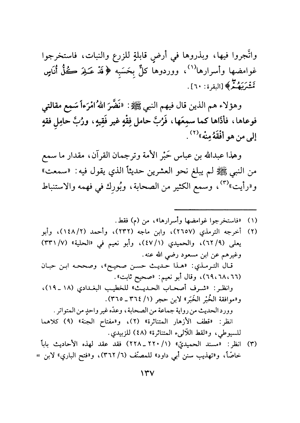 وهؤلاء هم الذين قال فيهم النبي -صَلَّى اللهُ عَلَيْهِ وَسَلَّمَ-: "نَضَّرَ اللهُ امْرَءًا سَمِع مقالتي فوعاها، فأدَّاها كما سمِعَها، فَرُبَّ حامل فِقْهٍ غير فَقِيهٍ، ورُبَّ حامِلِ فقهٍ إلى من هو أفْقَهُ مِنْه" (¬٢) .