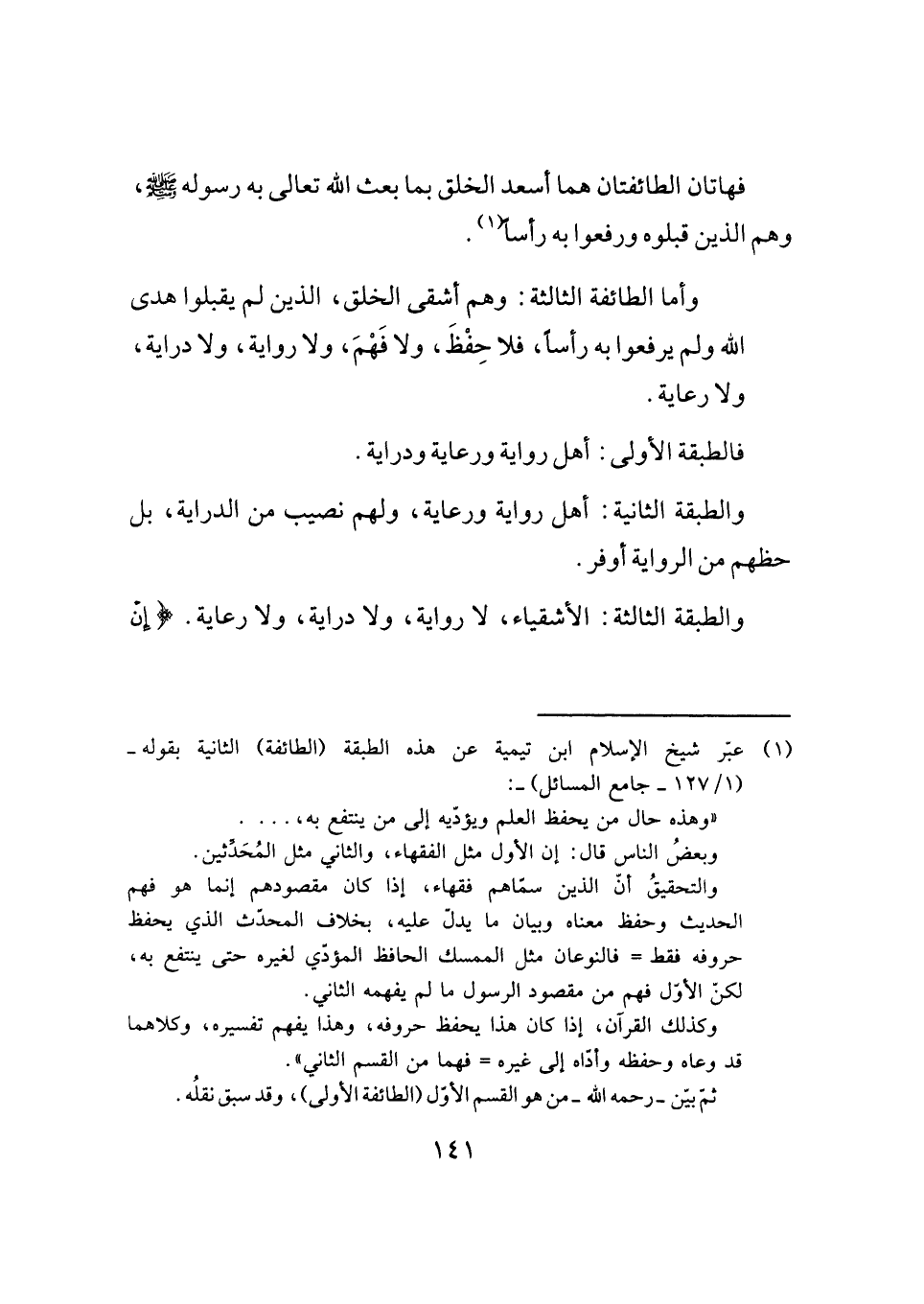 (¬١) عبّر شيخ الإسلام ابن تيمية عن هذه الطبقة (الطائفة) الثانية بقوله - (١/ ١٢٧ - جامع المسائل) -:
