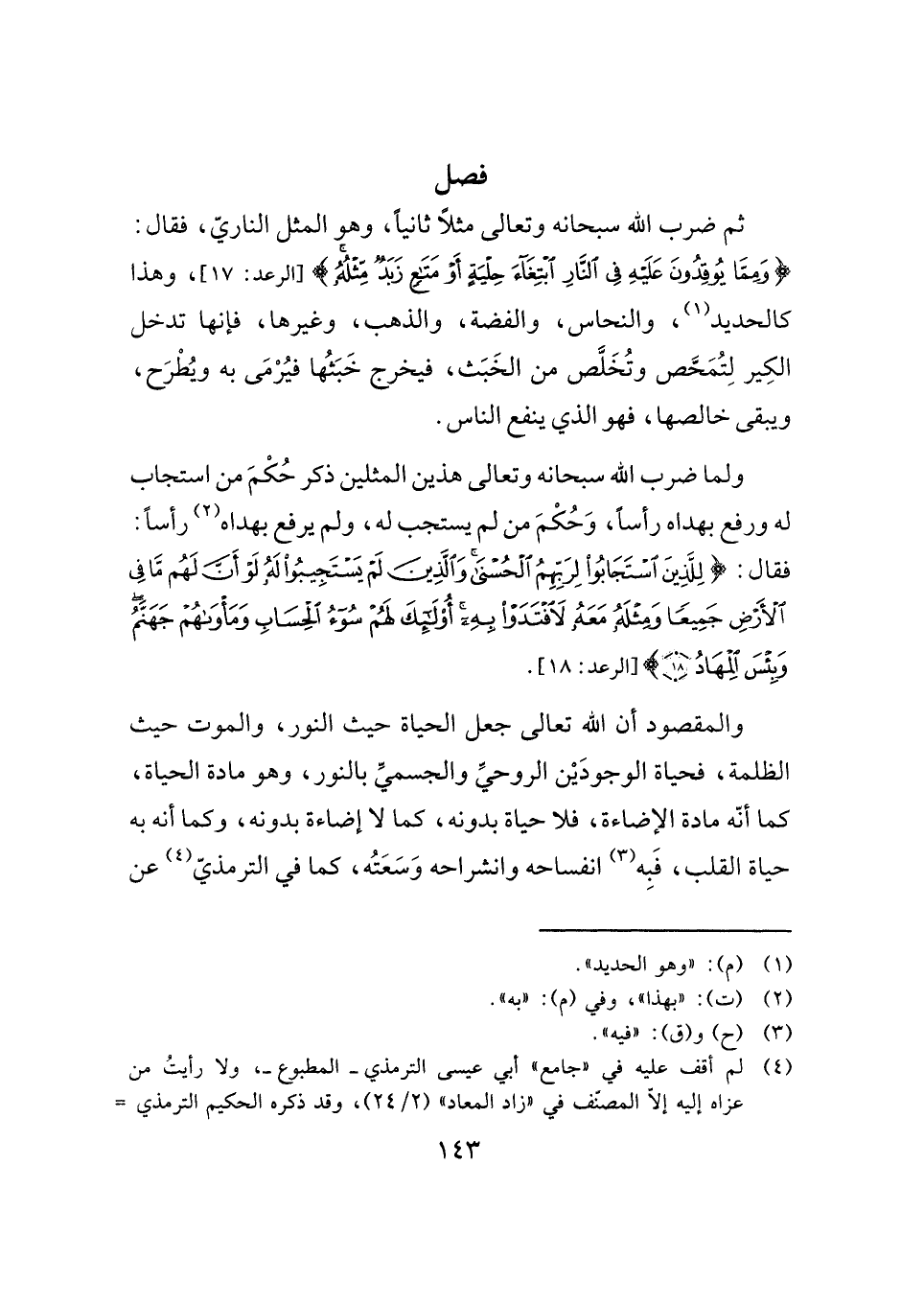 والمقصود أن الله تعالى جعل الحياة حيث النور، والموت حيث الظلمة، فحياة الوجودَيْن الروحيِّ والجسميِّ بالنور، وهو مادة الحياة، كما أنّه مادة الإضاءة، فلا حياة بدونه، كما لا إضاءة بدونه، وكما أنه به حياة القلب، فَبِه (¬٣) انفساحه وانشراحه وَسَعَتُه، كما في الترمذيّ (¬٤) عن