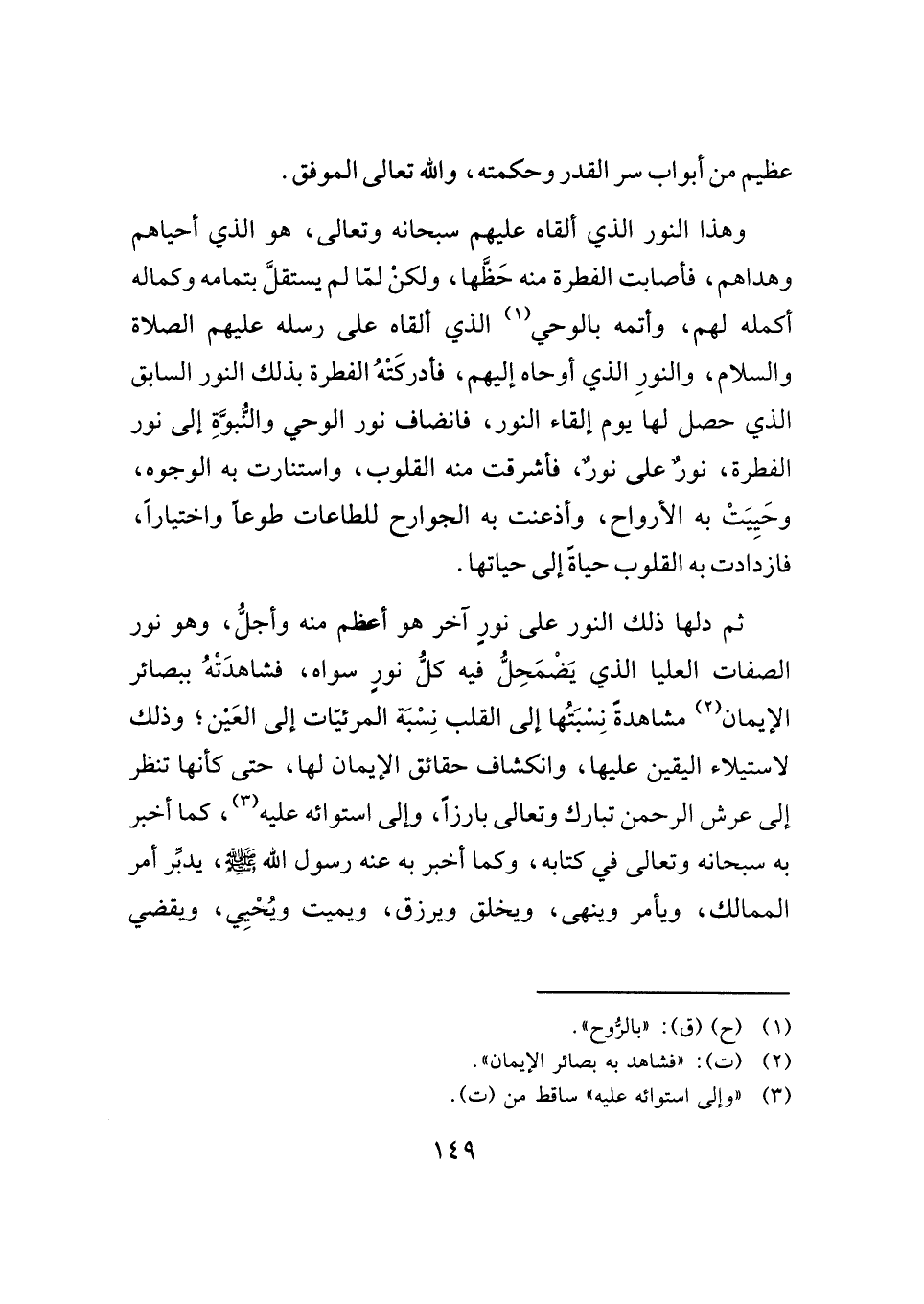 ثم دلها ذلك النور على نورٍ آخر هو أعظم منه وأجلُّ، وهو نور الصفات العليا الذي يَضْمَحِلُّ فيه كلُّ نورٍ سواه، فشاهدَتْهُ ببصائر الإيمان (¬٢) مشاهدةً نِسْبَتُها إلى القلب نِسْبَة المرئيّات إلى العَيْن؛ وذلك لاستيلاء اليقين عليها، وانكشاف حقائق الإيمان لها، حتى كأنها تنظر إلى عرش الرحمن تبارك وتعالى بارزًا، وإلى استوائه عليه (¬٣) ، كما أخبر به سبحانه وتعالى في كتابه، وكما أخبر به عنه رسول الله -صَلَّى اللهُ عَلَيْهِ وَسَلَّمَ-، يدبِّر أمر الممالك، ويأمر وينهى، ويخلق ويرزق، ويميت ويُحْيِي، ويقضي