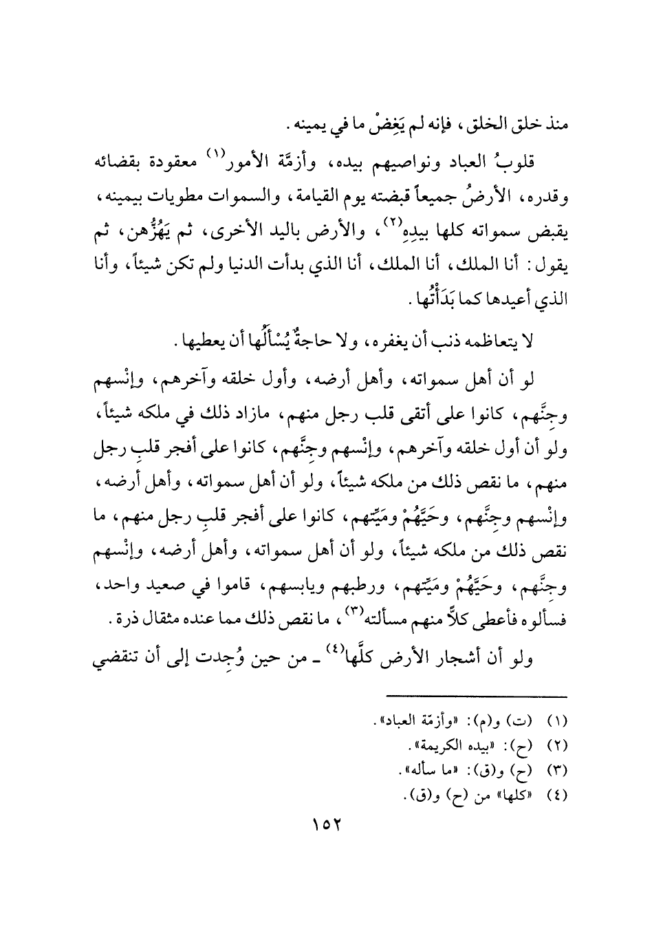 لو أن أهل سمواته، وأهل أرضه، وأول خلقه وآخرهم، وإنْسهم وجِنَّهم، كانوا على أتقى قلب رجل منهم، ما زاد ذلك في ملكه شيئًا، ولو أن أول خلقه وآخرهم، وإنْسهم وجِنَّهم، كانوا على أفجر قلبِ رجل منهم، ما نقص ذلك من ملكه شيئًا، ولو أن أهل سمواته، وأهل أرضه، وإنْسهم وجِنَّهم، وحَيَّهُمْ ومَيِّتهم، كانوا على أفجر قلبِ رجل منهم، ما نقص ذلك من ملكه شيئًا، ولو أن أهل سمواته، وأهل أرضه، وإنْسهم وجِنَّهم، وحَيَّهُمْ ومَيِّتهم، ورطبهم ويابسهم، قاموا في صعيد واحد، فسألوه فأعطى كلًّا منهم مسألته (¬٣) ، ما نقص ذلك مما عنده مثقال ذرة.