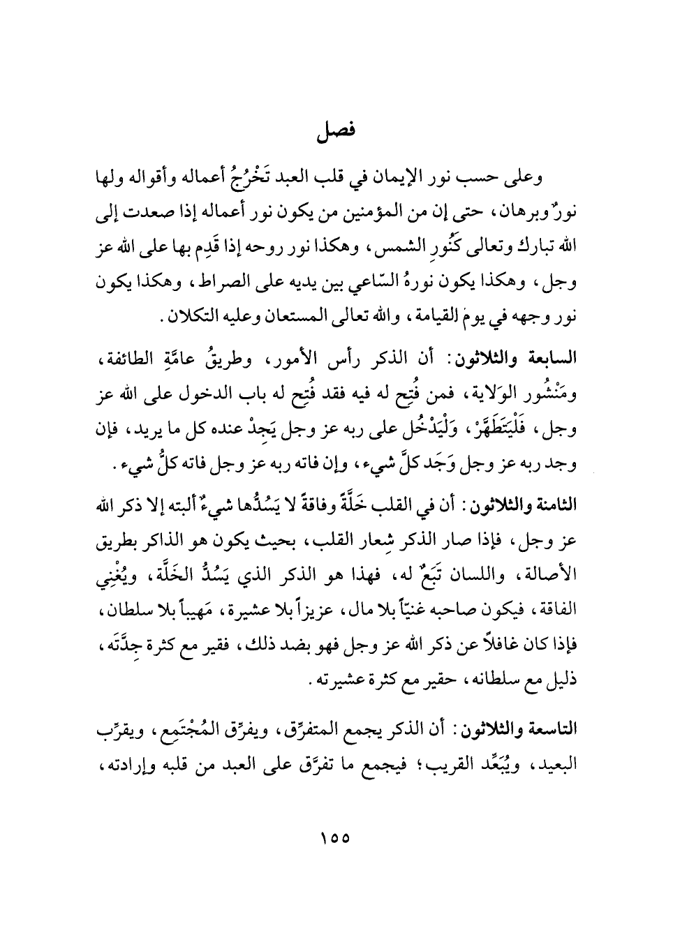 السابعة والثلاثون: أن الذكر رأس الأمور، وطريقُ عامَّةِ الطائفة، ومَنْشُور الوَلاية، فمن فُتِح له فيه فقد فُتِح له باب الدخول على الله عز وجل، فَلْيَتَطَهَّرْ، وَلْيَدْخُل على ربه عز وجل يَجِدْ عنده كل ما يريد، فإن وجد ربه عز وجل وَجَد كلَّ شيء، وإن فاته ربه عز وجل فاته كلُّ شيء.