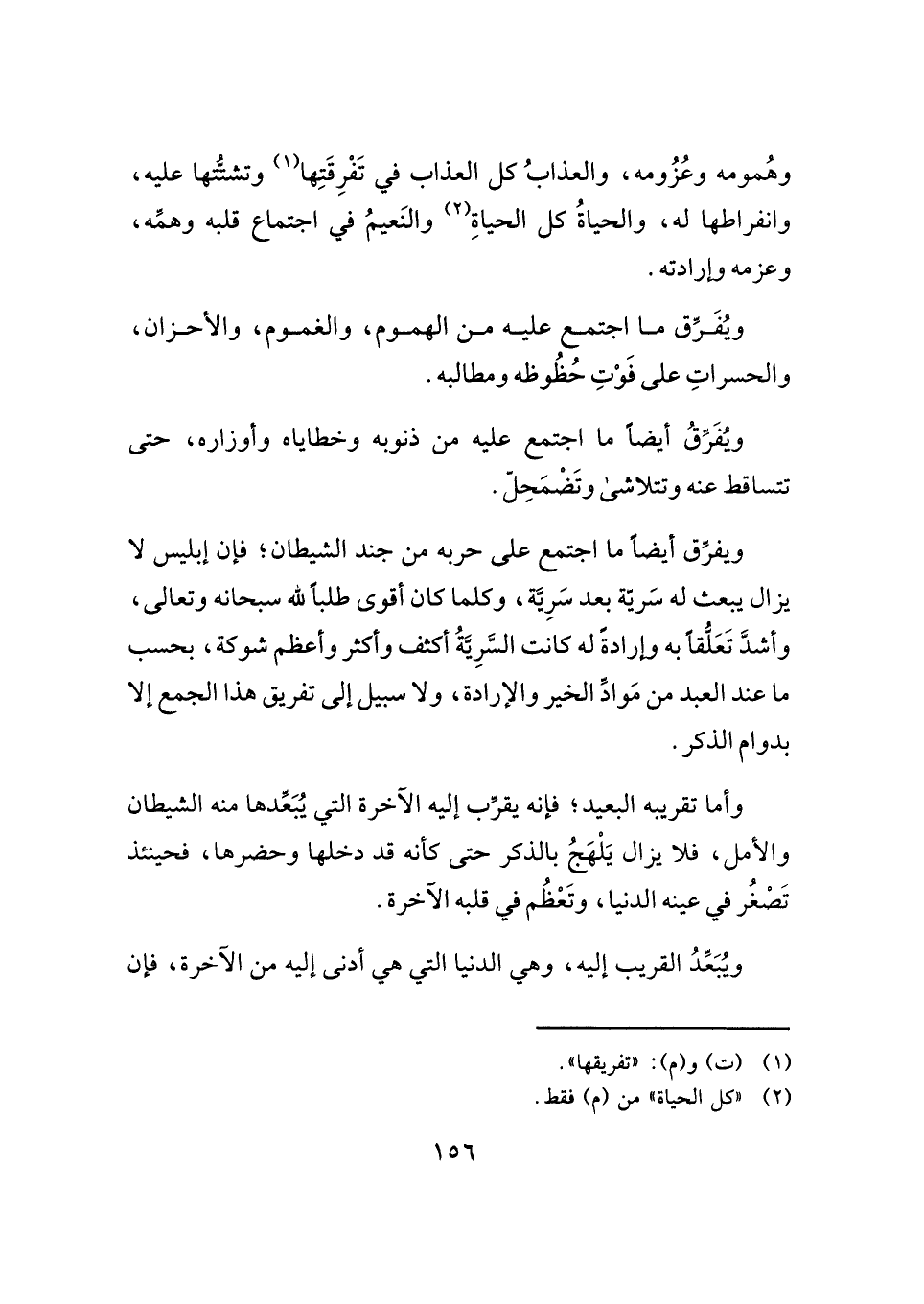 وهُمومه وعُزُومه، والعذابُ كل العذاب في تَفْرِقَتِها (¬١) وتشتُّتها عليه، وانفراطها له، والحياةُ كل الحياةِ (¬٢) والنَّعيمُ في اجتماع قلبه وهمِّه، وعزمه وإرادته.
