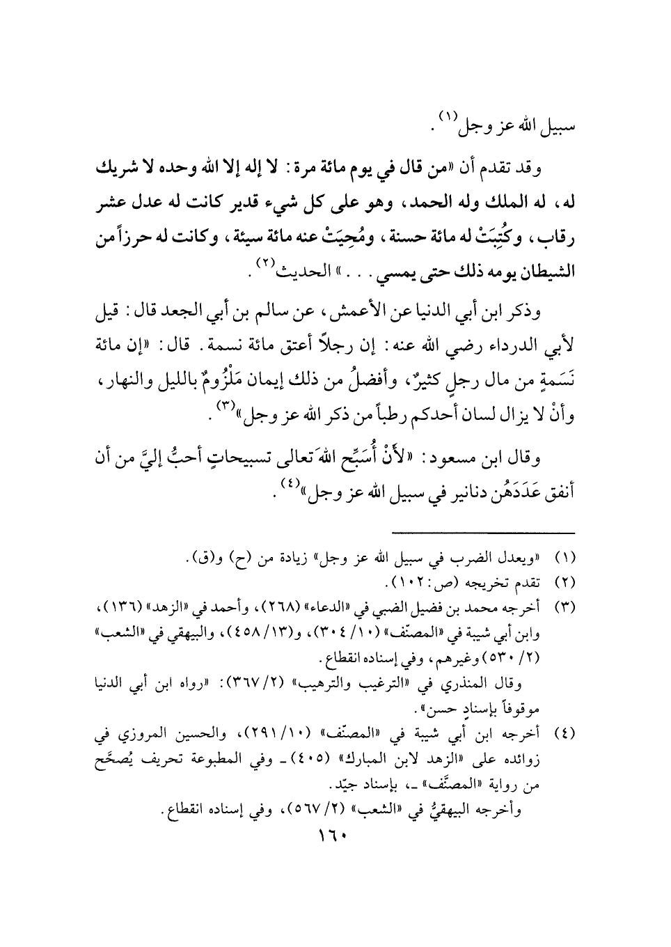 وقال ابن مسعود: "لأَنْ أُسَبِّح اللهَ تعالى تسبيحاتٍ أحبُّ إليَّ من أن أنفق عَدَدَهُن دنانير في سبيل الله عز وجل" (¬٤) .