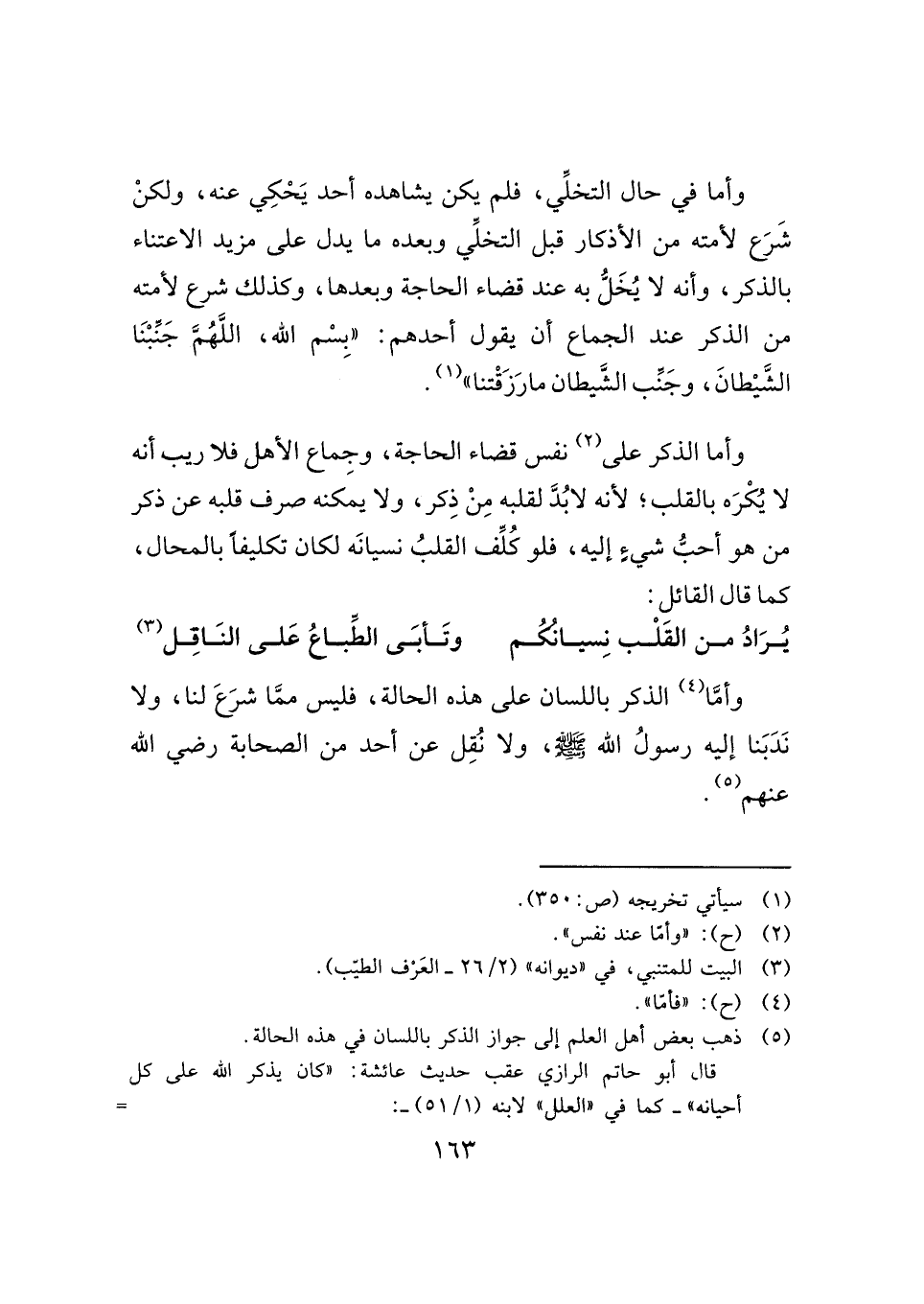 وأما في حال التخلِّي، فلم يكن يشاهده أحد يَحْكِي عنه، ولكنْ شَرَع لأمته من الأذكار قبل التخلِّي وبعده ما يدل على مزيد الاعتناء بالذكر، وأنه لا يُخَلُّ به عند قضاء الحاجة وبعدها، وكذلك شرع لأمته من الذكر عند الجماع أن يقول أحدهم: "بِسْم الله، اللَّهُمَّ جَنِّبْنَا الشَّيْطانَ، وجَنِّب الشَّيطان ما رَزَقْتنا" (¬١) .