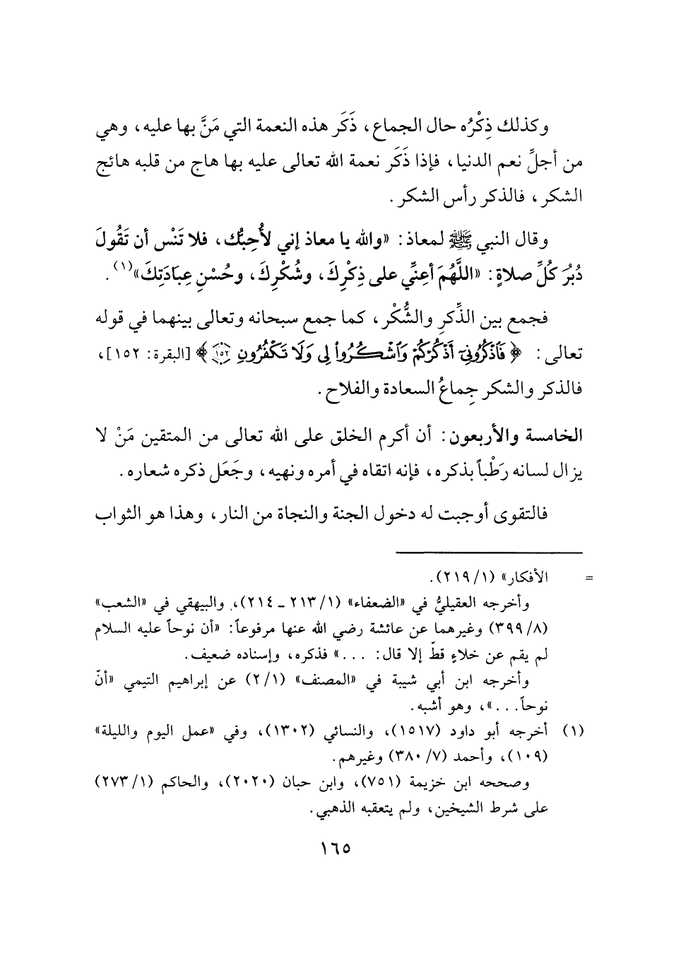 وقال النبي -صَلَّى اللهُ عَلَيْهِ وَسَلَّمَ- لمعاذ: "والله يا معاذ إني لأُحِبُّك، فلا تَنْس أن تَقُولَ دُبُرَ كُلِّ صلاةٍ: "اللَّهُمَّ أعِنِّي على ذِكْرِكَ، وشُكْرِكَ، وحُسْنِ عِبَادَتِكَ" (¬١).