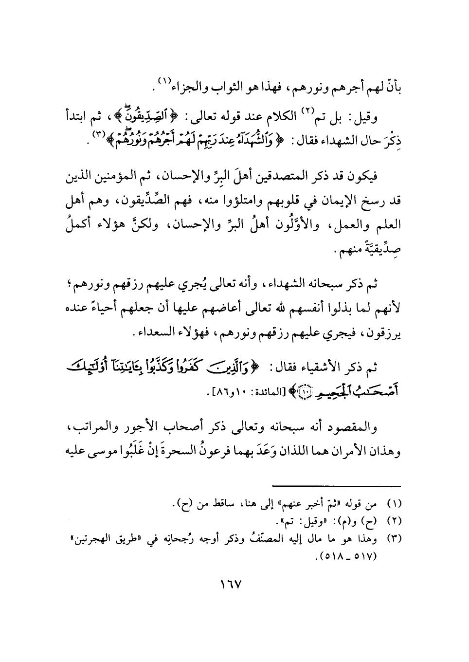 فيكون قد ذكر المتصدقين أهلَ البِرِّ والإحسان، ثم المؤمنين الذين قد رسخ الإيمان في قلوبهم وامتلؤوا منه، فهم الصِّدِّيقون، وهم أهل العلم والعمل، والأوَّلُون أهلُ البرِّ والإحسان، ولكنَّ هؤلاء أكملُ صِدِّيقيَّةً منهم.