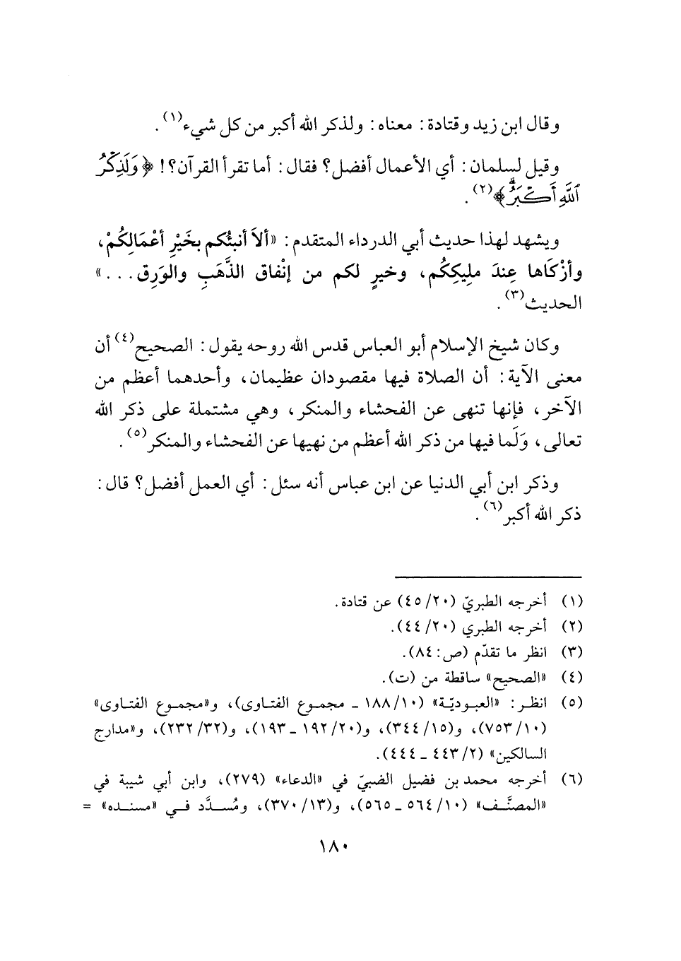 وذكر ابن أبي الدنيا عن ابن عباس أنه سئل: أي العمل أفضل؟ قال: ذكر الله أكبر (¬٦) .