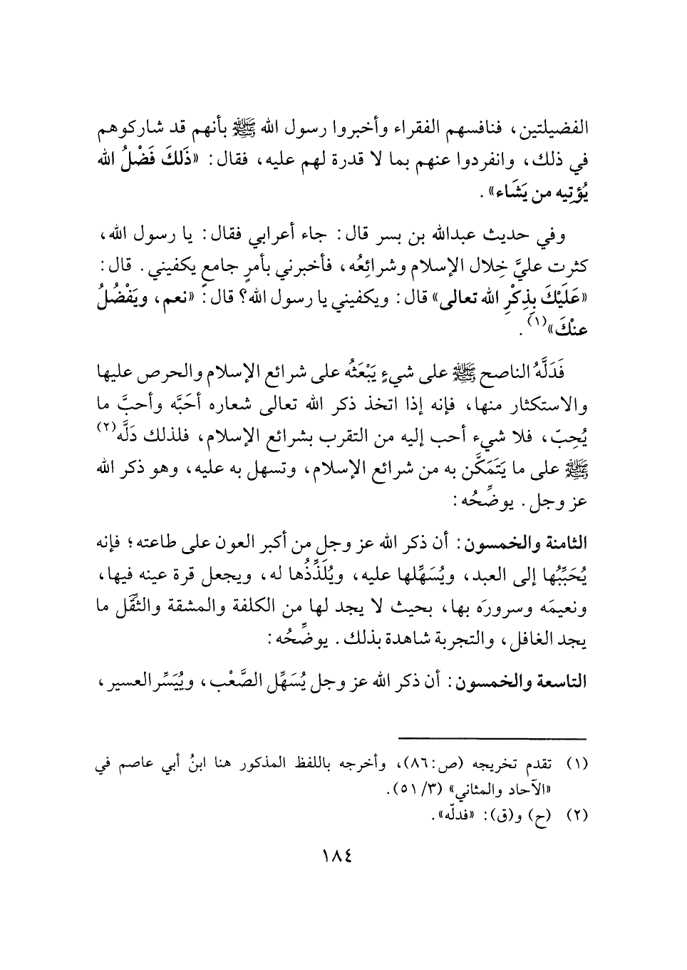وفي حديث عبد الله بن بسر قال: جاء أعرابي فقال: يا رسول الله، كثرت عليَّ خِلال الإسلام وشرائِعُه، فأخبرني بأمرٍ جامعٍ يكفيني. قال: "عَلَيْكَ بِذِكْرِ الله تعالى" قال: ويكفيني يا رسول الله؟ قال: "نعم، ويَفْضُلُ عنْكَ" (¬١).