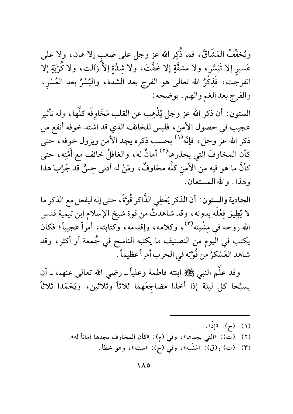 وقد علَّم النبي -صَلَّى اللهُ عَلَيْهِ وَسَلَّمَ- ابنته فاطمة وعليًّا -رضي الله تعالى عنهما- أن يسبِّحا كل ليلة إذا أخذا مضاجِعَهما ثلاثًا وثلاثين، ويَحْمَدا ثلاثًا