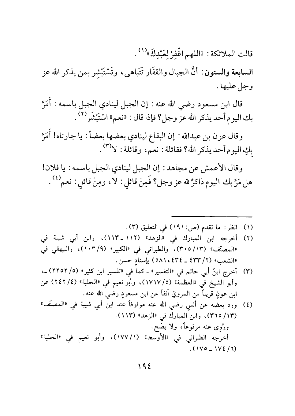 وقال الأعمش عن مجاهد: إن الجبل لينادي الجبل باسمه: يا فلان! هل مَرَّ بك اليوم ذاكرٌ لله عز وجل؟ فَمِنْ قائلٍ: لا، ومِنْ قائلٍ: نعم (¬٤).