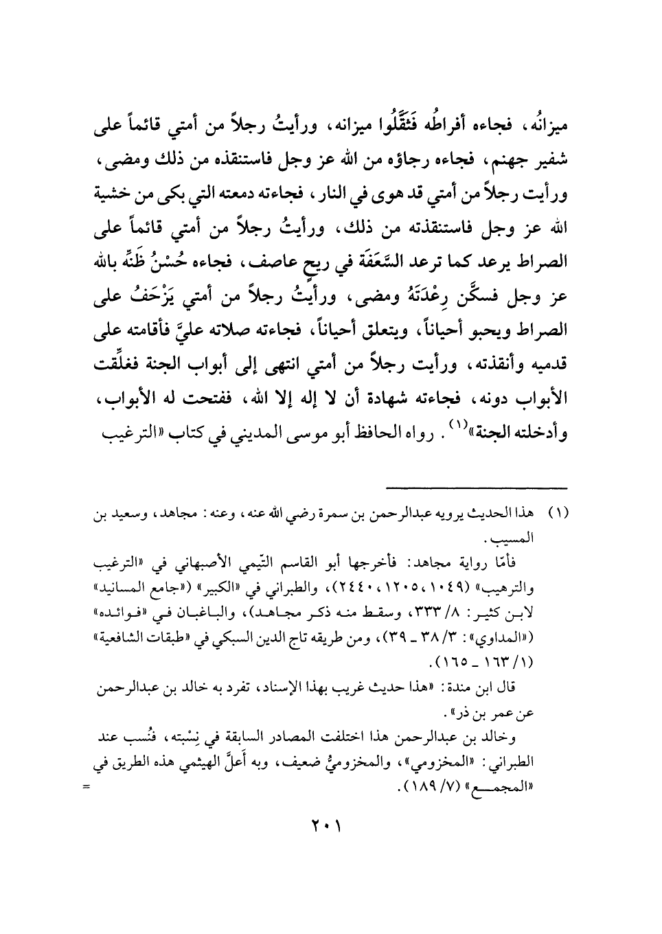 ميزانُه، فجاءه أفراطُه فَثَقَّلُوا ميزانه، ورأيتُ رجلًا من أمتي قائمًا على شفير جهنم، فجاءه رجاؤه من الله عز وجل فاستنقذه من ذلك ومضى، ورأيت رجلًا من أمتي قد هوى في النار، فجاءته دمعته التي بكى من خشية الله عز وجل فاستنقذته من ذلك، ورأيتُ رجلًا من أمتي قائمًا على الصراط يرعد كما ترعد السَّعَفَة في ريحٍ عاصف، فجاءه حُسْنُ ظَنِّه بالله عز وجل فسكَّن رِعْدَتَهُ ومضى، ورأيتُ رجلًا من أمتي يَزْحَفُ على الصراط ويحبو أحيانًا، ويتعلق أحيانًا، فجاءته صلاته عليَّ فأقامته على قدميه وأنقذته، ورأيت رجلًا من أمتي انتهى إلى أبواب الجنة فغلِّقت الأبواب دونه، فجاءته شهادة أن لا إله إلا الله، ففتحت له الأبواب، وأدخلته الجنة" (¬١) . رواه الحافظ أبو موسى المديني في كتاب "الترغيب