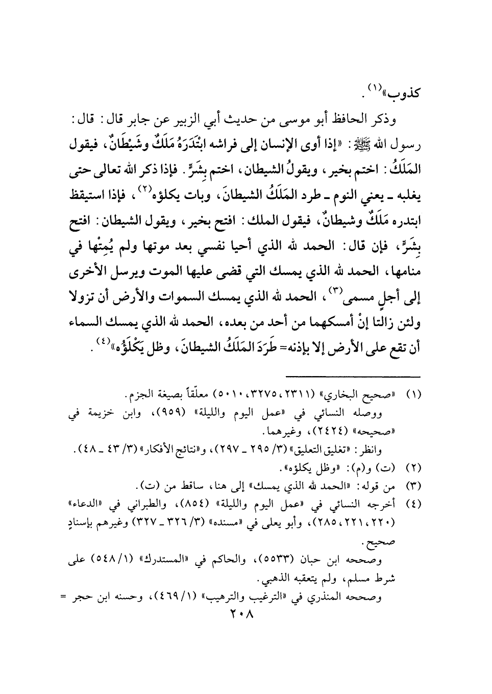 وذكر الحافظ أبو موسى من حديث أبي الزبير عن جابر قال: قال: رسول الله -صَلَّى اللهُ عَلَيْهِ وَسَلَّمَ-: "إذا أوى الإنسان إلى فراشه ابْتَدَرَهُ مَلَكٌ وشَيْطَانٌ، فيقول المَلَكُ: اختم بخير، ويقولُ الشيطان، اختم بِشَرٍّ. فإذا ذكر الله تعالى حتى يغلبه -يعني النوم- طرد المَلَكُ الشيطانَ، وبات يكلؤه (¬٢) ، فإذا استيقظ ابتدره مَلَكٌ وشيطانٌ، فيقول الملك: افتح بخير، ويقول الشيطان: افتح بِشَرٍّ، فإن قال: الحمد لله الذي أحيا نفسي بعد موتها ولم يُمِتْها في منامها، الحمد لله الذي يمسك التي قضى عليها الموت ويرسل الأخرى إلى أجلٍ مسمى (¬٣) ، الحمد لله الذي يمسك السموات والأرض أن تزولا ولئن زالتا إنْ أمسكهما من أحد من بعده، الحمد لله الذي يمسك السماء أن تقع على الأرض إلا بإذنه = طَرَدَ المَلَكُ الشيطانَ، وظل يَكْلَؤُه" (¬٤) .