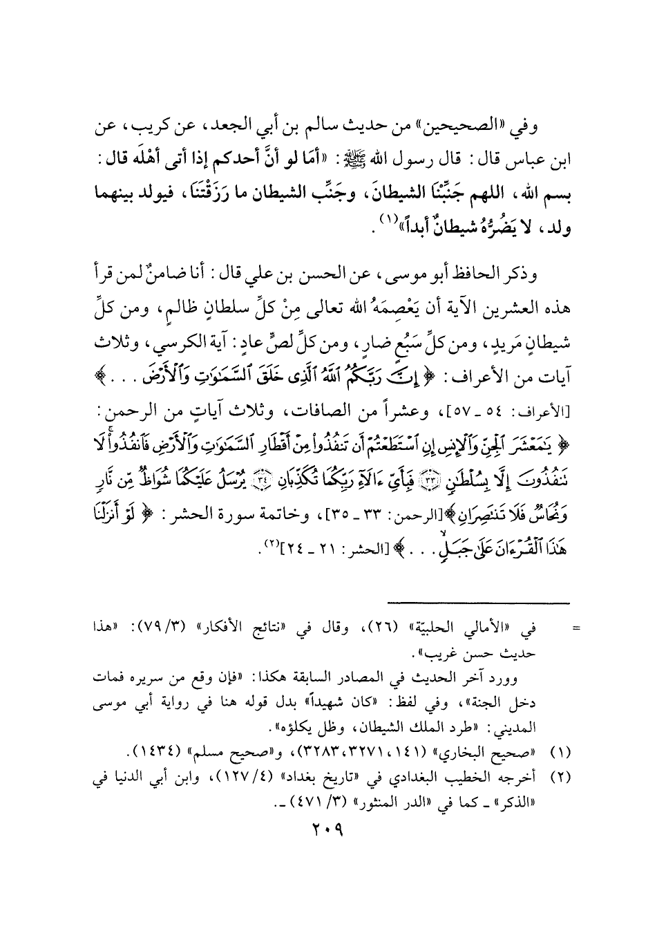 وذكر الحافظ أبو موسى، عن الحسن بن علي قال: أنا ضامنٌ لمن قرأ هذه العشرين الآية أن يَعْصِمَهُ الله تعالى مِنْ كلِّ سلطانٍ ظالمٍ، ومن كلِّ شيطانٍ مَريدٍ، ومن كلِّ سَبُعٍ ضارٍ، ومن كلِّ لصٍّ عادٍ: آية الكرسي، وثلاث آيات من الأعراف: {إِنَّ رَبَّكُمُ اللَّهُ الَّذِي خَلَقَ السَّمَاوَاتِ وَالْأَرْضَ. . .} [الأعراف: ٥٤ - ٥٧]، وعشرًا من الصافات، وثلاث آياتٍ من الرحمن: {يَامَعْشَرَ الْجِنِّ وَالْإِنْسِ إِنِ اسْتَطَعْتُمْ أَنْ تَنْفُذُوا مِنْ أَقْطَارِ السَّمَاوَاتِ وَالْأَرْضِ فَانْفُذُوا لَا تَنْفُذُونَ إِلَّا بِسُلْطَانٍ (٣٣) فَبِأَيِّ آلَاءِ رَبِّكُمَا تُكَذِّبَانِ (٣٤) يُرْسَلُ عَلَيْكُمَا شُوَاظٌ مِنْ نَارٍ وَنُحَاسٌ فَلَا تَنْتَصِرَانِ (٣٥) } [الرحمن: ٣٣ - ٣٥]، وخاتمة سورة الحشر: {لَوْ أَنْزَلْنَا هَذَا الْقُرْآنَ عَلَى جَبَلٍ. . .} [الحشر: ٢١ - ٢٤] (¬٢) .
