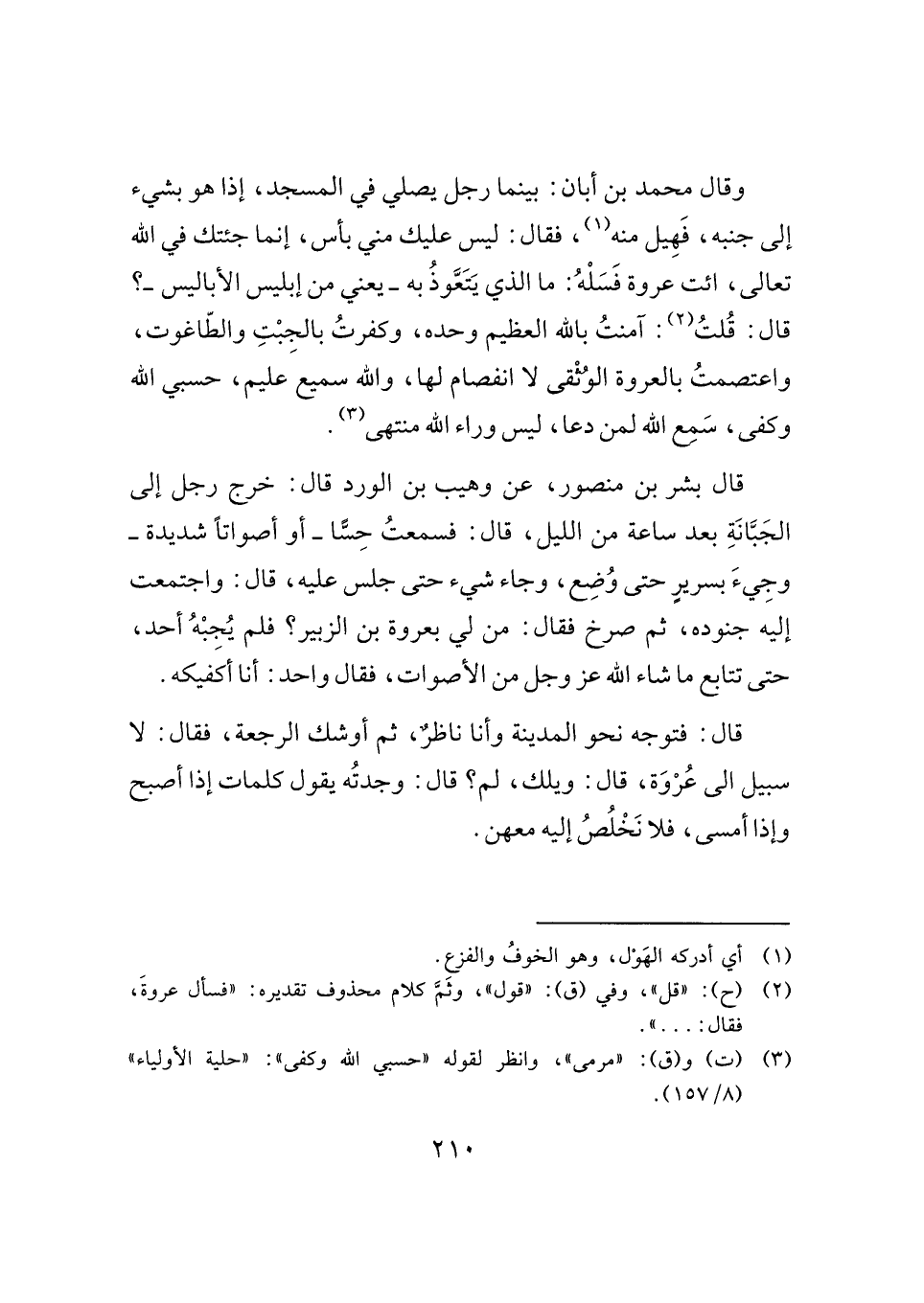 وقال محمد بن أبان: بينما رجل يصلي في المسجد، إذا هو بشيء إلى جنبه، فَهِيل منه (¬١) ، فقال: ليس عليك مني بأس، إنما جئتك في الله تعالى، ائت عروة فَسَلْهُ: ما الذي يَتَعَّوذُ به -يعني من إبليس الأباليس-؟ قال: قُلتُ (¬٢) : آمنتُ بالله العظيم وحده، وكفرتُ بالجِبْتِ والطاغوت، واعتصمتُ بالعروة الوُثْقى لا انفصام لها، والله سميع عليم، حسبي الله وكفى، سَمِع الله لمن دعا، ليس وراء الله منتهى (¬٣) .