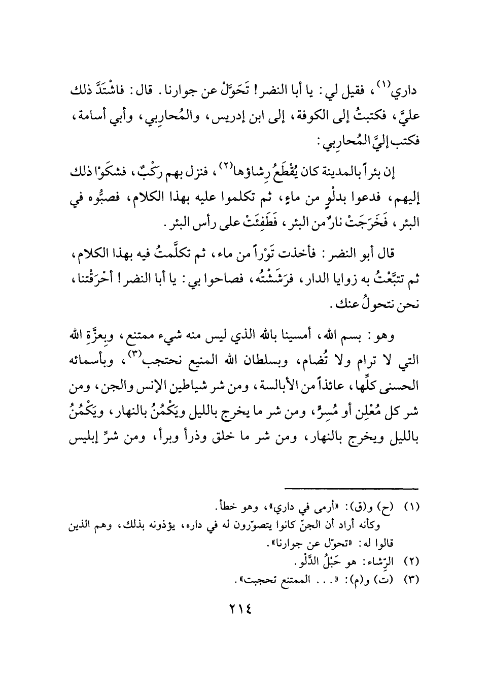قال أبو النضر: فأخذت تَوْرًا من ماء، ثم تكلَّمتُ فيه بهذا الكلام، ثم تتبَّعْتُ به زوايا الدار، فرَشَشْتُه، فصاحوا بى: يا أبا النضر! أحْرَقْتنا، نحن نتحولُ عنك.