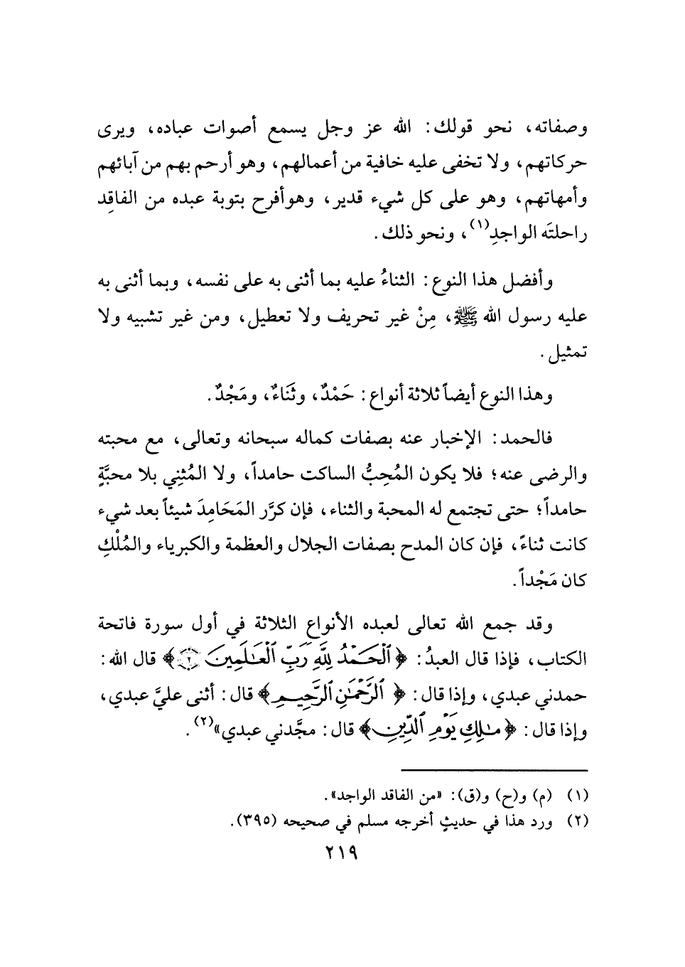 فالحمد: الإخبار عنه بصفات كماله سبحانه وتعالى، مع محبته والرضى عنه؛ فلا يكون المُحِبُّ الساكت حامدًا، ولا المُثنِي بلا محبَّةٍ حامدًا؛ حتى تجتمع له المحبة والثناء، فإن كرَّر المَحَامِدَ شيئًا بعد شيء كانت ثناءً، فإن كان المدح بصفات الجلال والعظمة والكبرياء والمُلْكِ كان مَجْدًا.