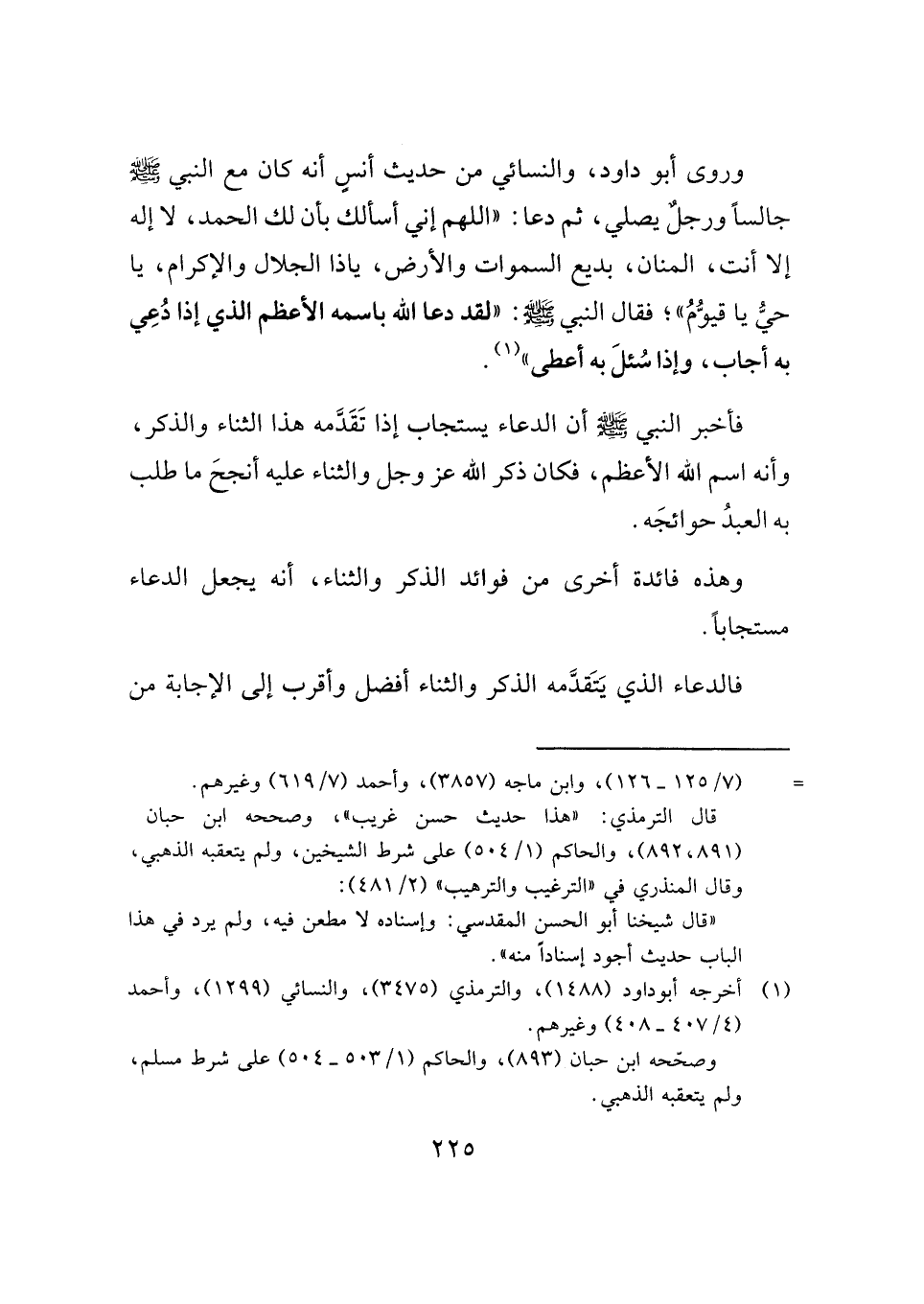 وروى أبو داود، والنسائي من حديث أنسٍ أنه كان مع النبي -صَلَّى اللهُ عَلَيْهِ وَسَلَّمَ- جالسًا ورجلٌ يصلي، ثم دعا: "اللَّهُمَّ إني أسألك بأن لك الحمد، لا إله إلا أنت، المنان، بديع السموات والأرض، ياذا الجلال والإكرام، يا حيُّ يا قيُّومُ"؛ فقال النبي -صَلَّى اللهُ عَلَيْهِ وَسَلَّمَ-: "لقد دعا الله باسمه الأعظم الذي إذا دُعِي به أجاب، وإذا سُئلَ به أعطى" (¬١).