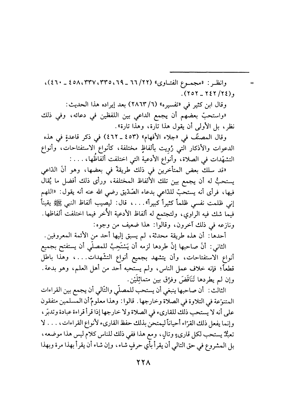 "قد سلك بعض المتأخرين في ذلك طريقةً في بعضها، وهو أنّ الدّاعي يستحبُّ له أن يجمع بين تلك الألفاظ المختلفة، ورأى ذلك أفضل ما يُقال فيها، فرأى أنه يستحبّ للدّاعي بدعاء الصديق رضي الله عنه أنه يقول: "اللَّهُمَّ إني ظلمت نفسي ظلمًا كثيرًا كبيرًا". . .، قال: ليصيب ألفاظ النبي -صَلَّى اللهُ عَلَيْهِ وَسَلَّمَ- يقينًا فيما شك فيه الراوي، ولتجتمع له ألفاظ الأدعية الأُخر فيما اختلفت ألفاظها. ونازعه في ذلك آخرون، وقالوا: هذا ضعيف من وجوه: