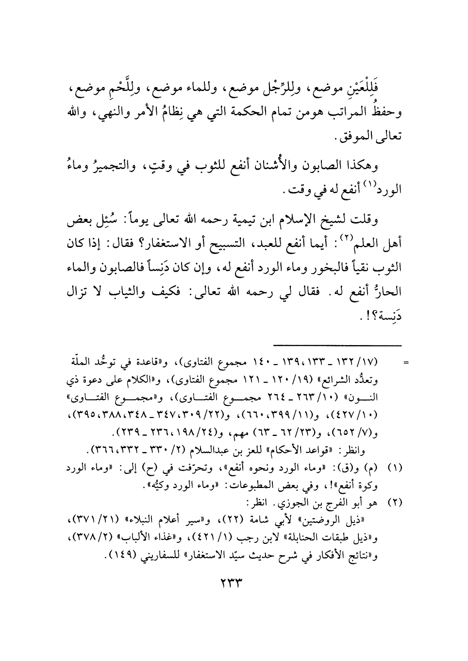 وقلت لشيخ الإسلام ابن تيمية رحمه الله تعالى يومًا: سُئِل بعض أهل العلم (¬٢) : أيما أنفع للعبد، التسبيح أو الاستغفار؟ فقال: إذا كان الثوب نقيًّا فالبخور وماء الورد أنفع له، وإن كان دَنِسًا فالصابون والماء الحارُّ أنفع له. فقال لي رحمه الله تعالى: فكيف والثياب لا تزال دَنِسة؟!.