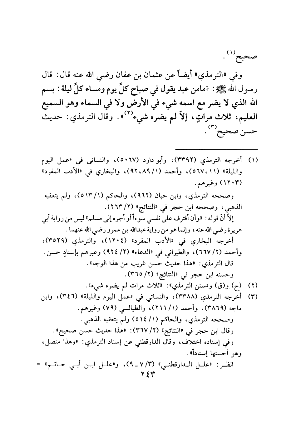 وفي "الترمذي" أيضًا عن عثمان بن عفان رضي الله عنه قال: قال رسول الله -صَلَّى اللهُ عَلَيْهِ وَسَلَّمَ-: "ما من عبد يقول في صباح كلِّ يوم ومساء كلِّ ليلة: بسم الله الذي لا يضر مع اسمه شيء في الأرض ولا في السماء وهو السميع العليم، ثلاث مراتٍ، إلّا لم يضره شيء (¬٢) ". وقال الترمذي: حديث حسن صحيح (¬٣) .