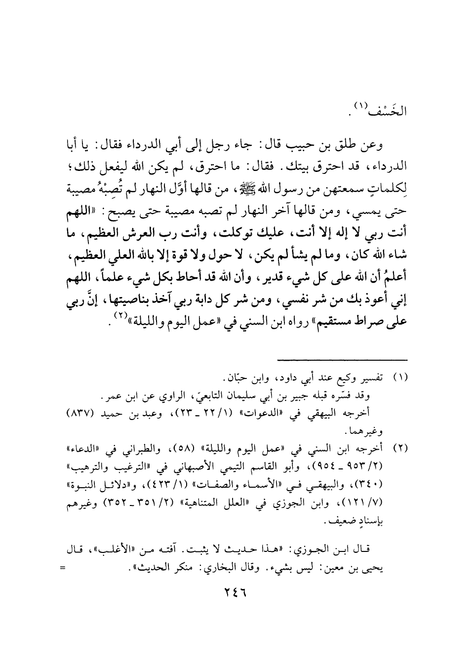 وعن طلق بن حبيب قال: جاء رجل إلى أبي الدرداء فقال: يا أبا الدرداء، قد احترق بيتك. فقال: ما احترق، لم يكن الله ليفعل ذلك؛ لِكلماتٍ سمعتهن من رسول الله -صَلَّى اللهُ عَلَيْهِ وَسَلَّمَ-، من قالها أوَّل النهار لم تُصبْهُ مصيبة حتى يمسي، ومن قالها آخر النهار لم تصبه مصيبة حتى يصبح: "اللَّهُمَّ أنت ربي لا إله إلا أنت، عليك توكلت، وأنت رب العرش العظيم، ما شاء الله كان، وما لم يشأ لم يكن، لا حول ولا قوة إلا بالله العلي العظيم، أعلمُ أن الله على كل شيء قدير، وأن الله قد أحاط بكل شيء علمًا، اللَّهُمَّ إني أعوذ بك من شر نفسي، ومن شر كل دابة ربي آخذ بناصيتها، إنَّ ربي على صراط مستقيم" رواه ابن السني في "عمل اليوم والليلة" (¬٢) .