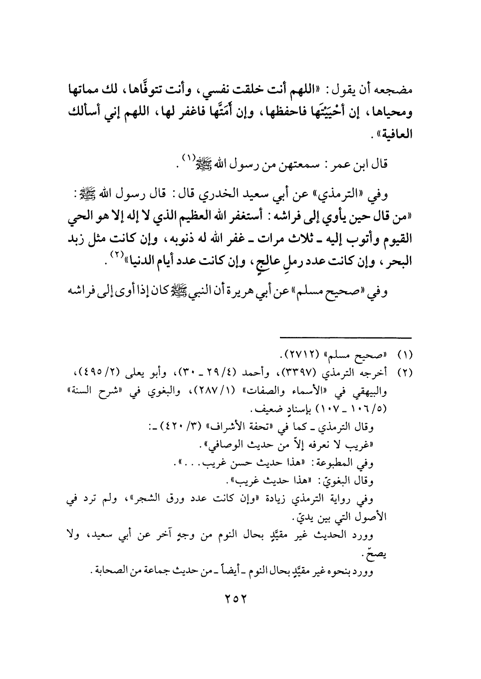 وفي "الترمذي" عن أبي سعيد الخدري قال: قال رسول الله -صَلَّى اللهُ عَلَيْهِ وَسَلَّمَ-: "من قال حين يأوي إلى فراشه: أستغفر الله العظيم الذي لا إله إلا هو الحي القيوم وأتوب إليه -ثلاث مرات- غفر الله له ذنوبه، وإن كانت مثل زبد البحر، وإن كانت عدد رملِ عالِجٍ، وإن كانت عدد أيام الدنيا" (¬٢) .