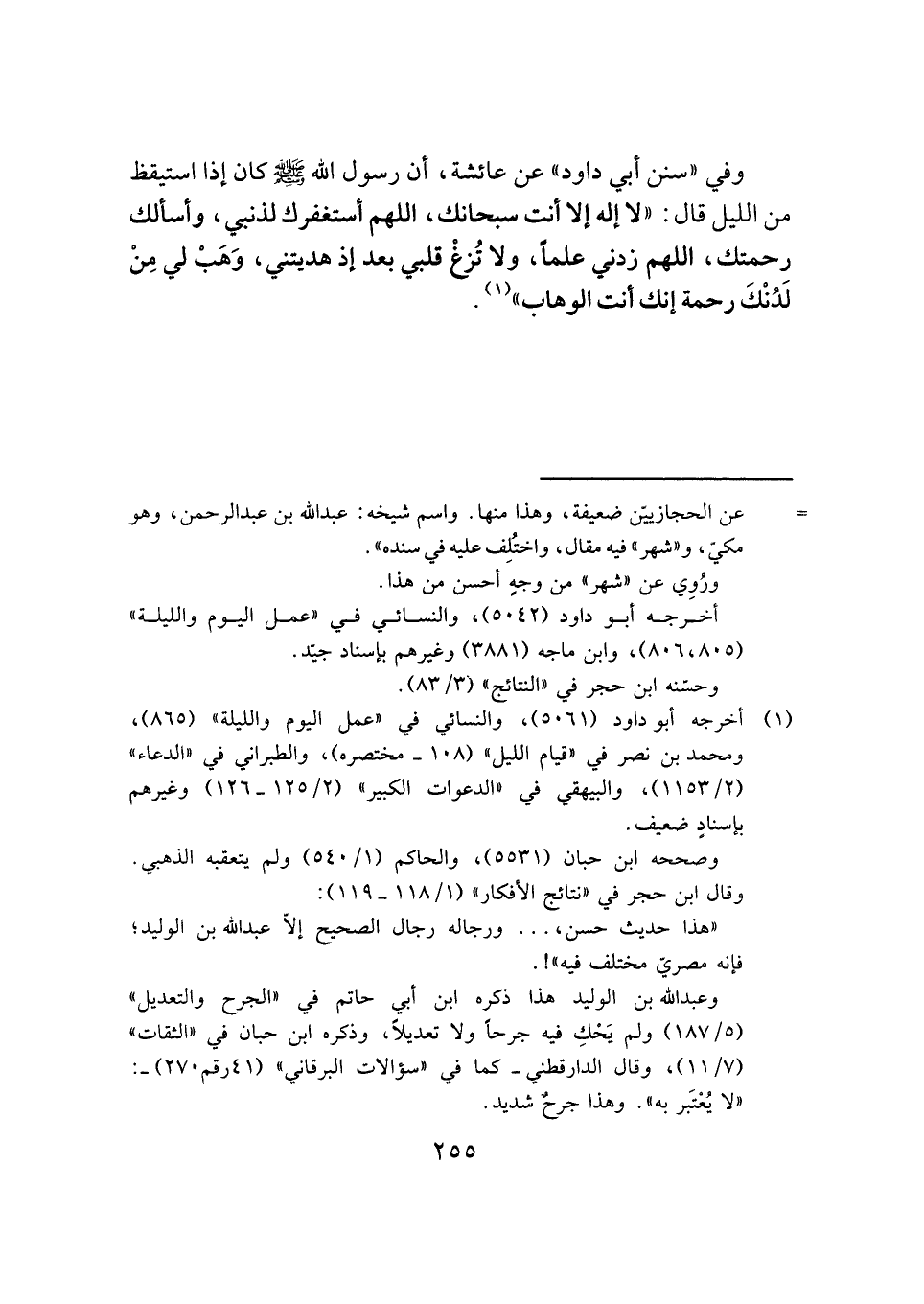 وفي "سنن أبي داود" عن عائشة، أن رسول الله -صَلَّى اللهُ عَلَيْهِ وَسَلَّمَ- كان إذا استيقظ من الليل قال: "لا إله إلا أنت سبحانك، اللَّهُمَّ أستغفرك لذنبي، وأسألك رحمتك، اللَّهُمَّ زدني علمًا، ولا تُزغْ قلبي بعد إذ هديتني، وَهَبْ لي مِنْ لَدُنْكَ رحمة إنك أنت الوهاب" (¬١) .