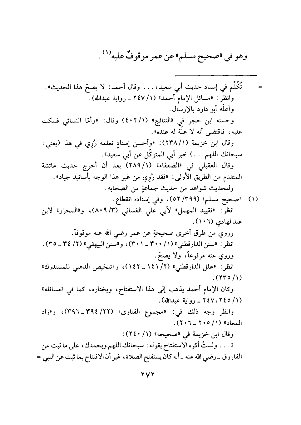 وقال ابن خزيمة (١/ ٢٣٨): "وأحسن إسنادٍ نعلمه رُوِي في هذا (يعني: سبحانك اللَّهُمَّ. . .) خبر أبي المتوكّل عن أبي سعيد".